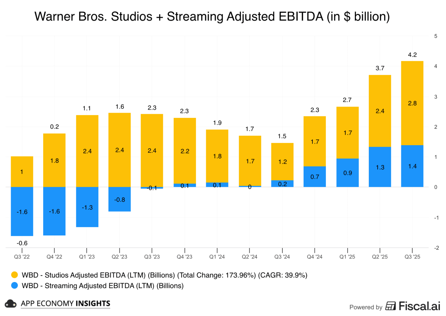 Warner’s Studios and Streaming segments reached ~$24 billion over the same period, mostly flat in the past two years. The majority of revenue is coming from Studios, including theatrical, licensing, and gaming.