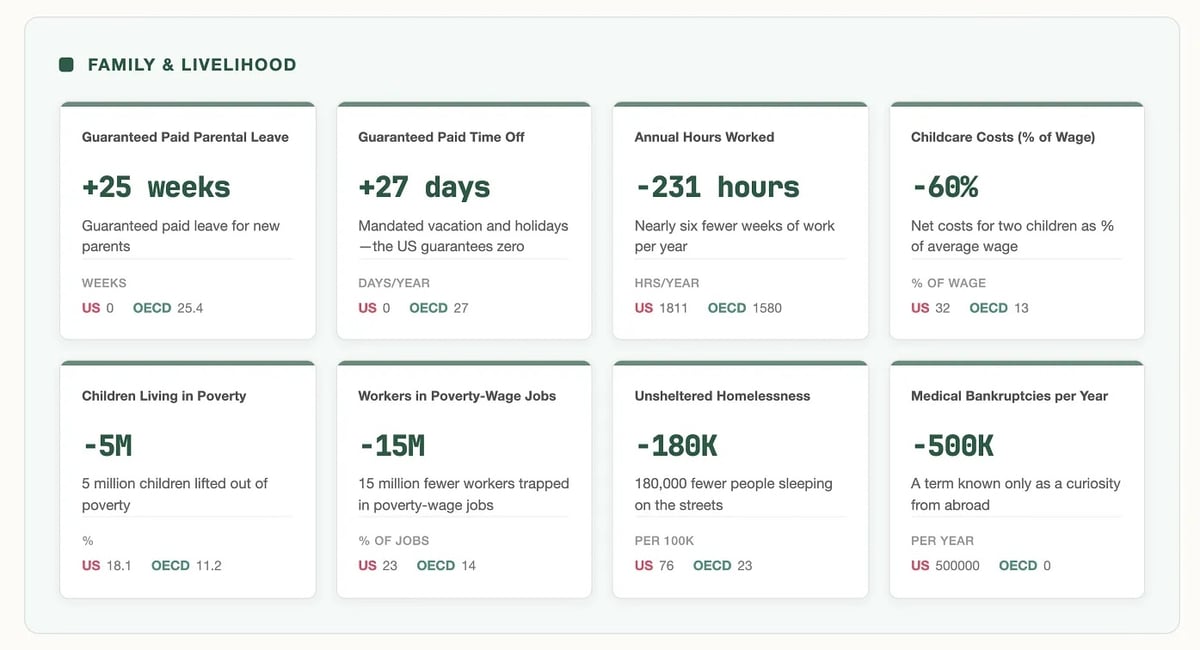 Start with work and economic life. Americans work longer hours, pay more out-of-pocket for college and childcare, lack parental leave, and enjoy less economic mobility. The share of income going to the top 1 percent is nearly double the OECD average. American CEOs earn, on average, 354 times as much as their workers. More workers are trapped in poverty-wage jobs. Collective bargaining covers fewer workers. And social protections are less generous for those who fall on hard times, with the government raising less in taxes and spending more on the military.