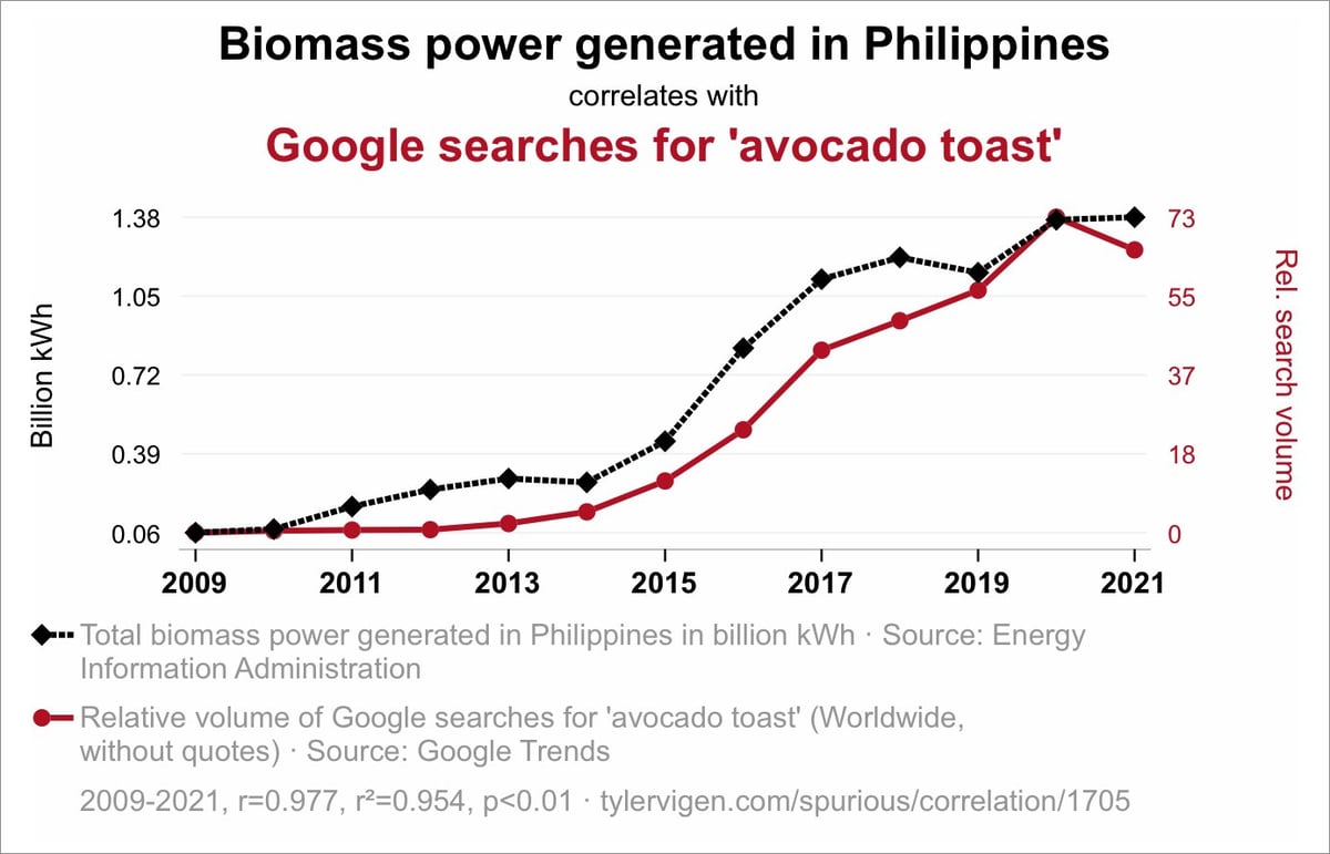 For his Spurious Correlations project, Tyler Vigen compares data sets that are the very definition of “correlation is not causation”. For instance, the number of Walmart stores worldwide correlates very strongly with the current distance between the Earth & Saturn. Or Google searches for “avocado toast” closely tracks biomass power generated in the Philippines.