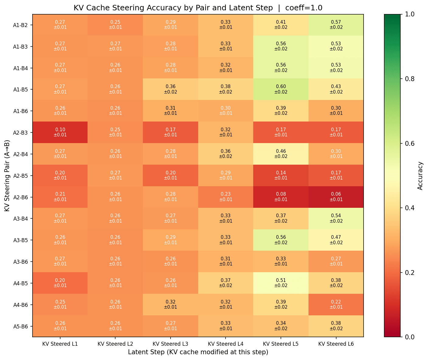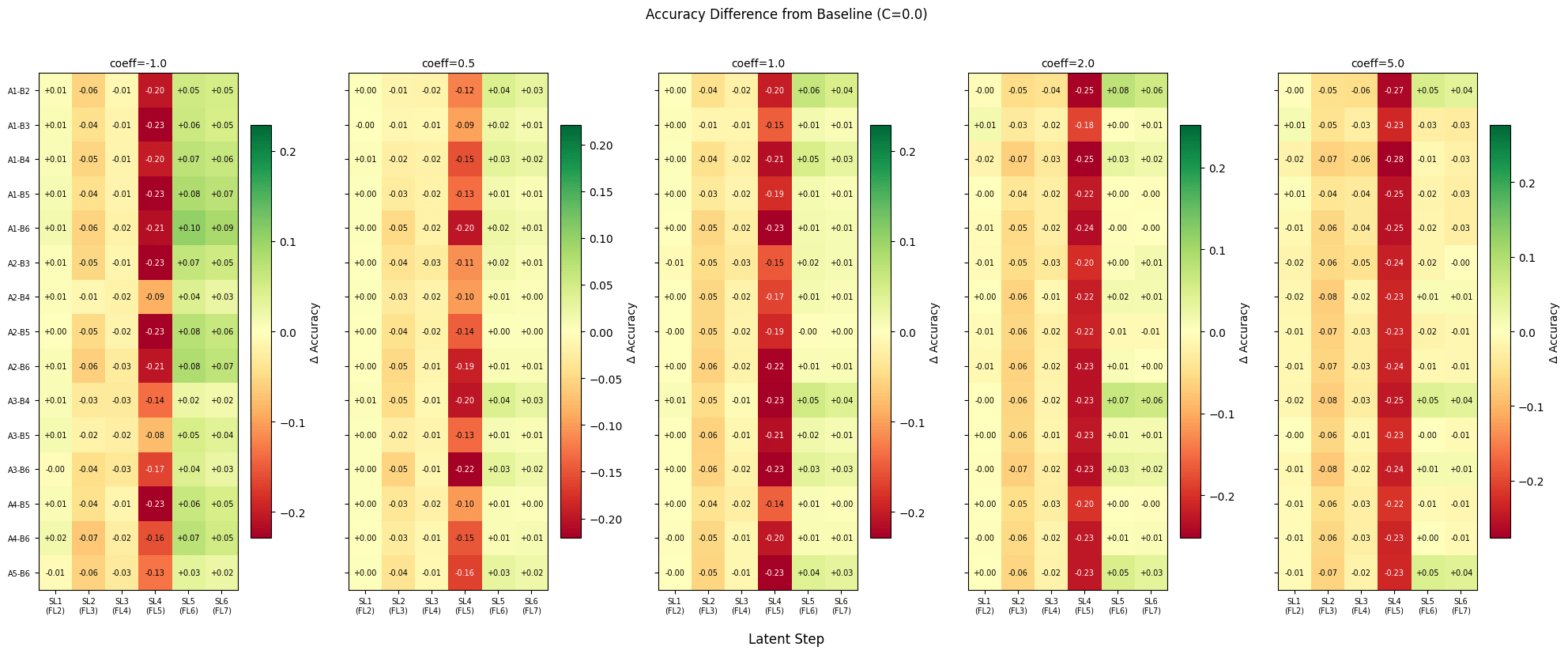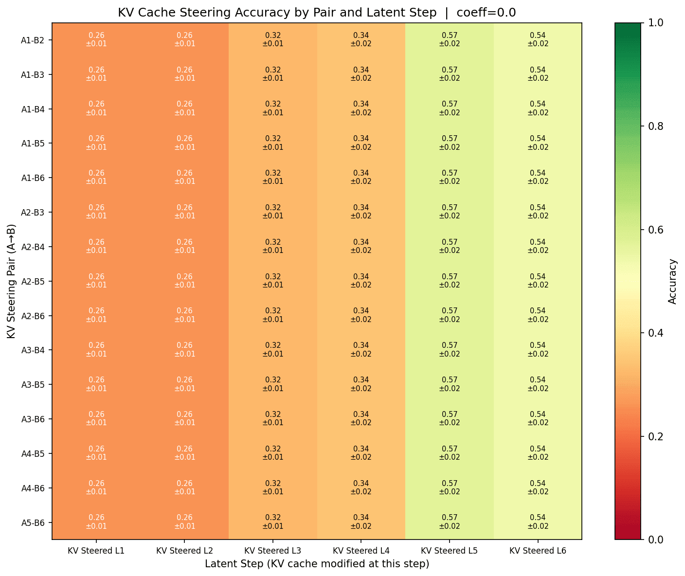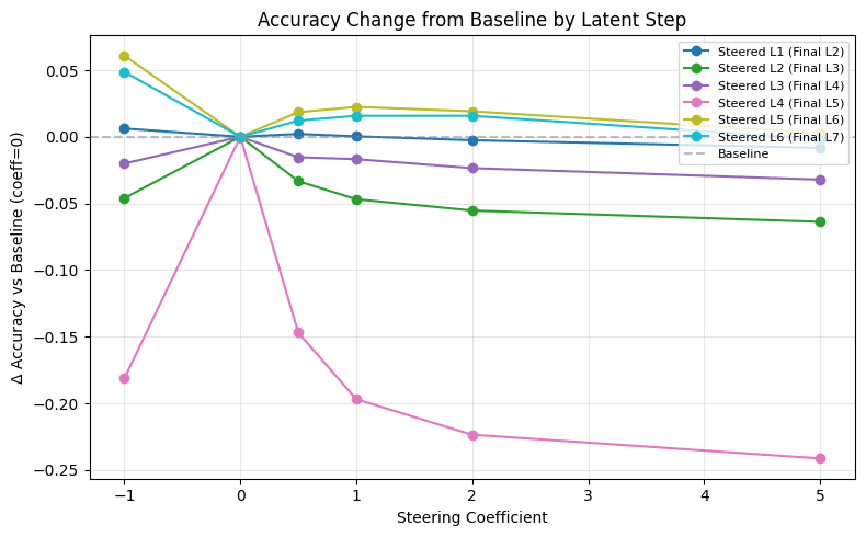 Across all coefficient values tested, the steering was applied to latents 1–4, with one additional latent step run afterward to obtain updated KV values. The steered models seem to consistently underperform the baseline of no steering until the later latents match the performance of random vector patching “Can we interpret latent reasoning using current mechanistic interpretability tools?”. This might be the case because steering acts the same as random vector patching as the average difference vector might be too noisy to encode meaningful directional information.