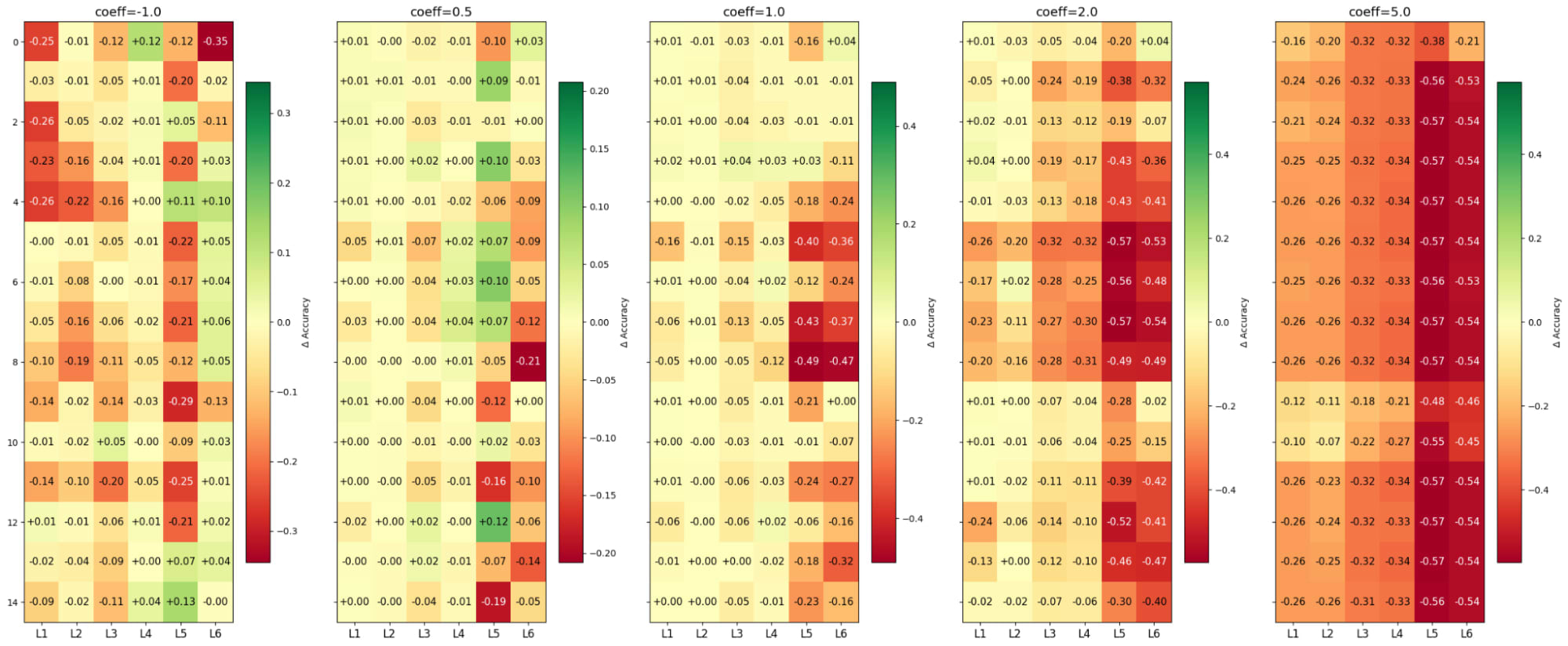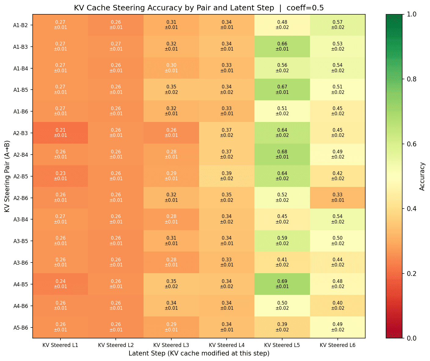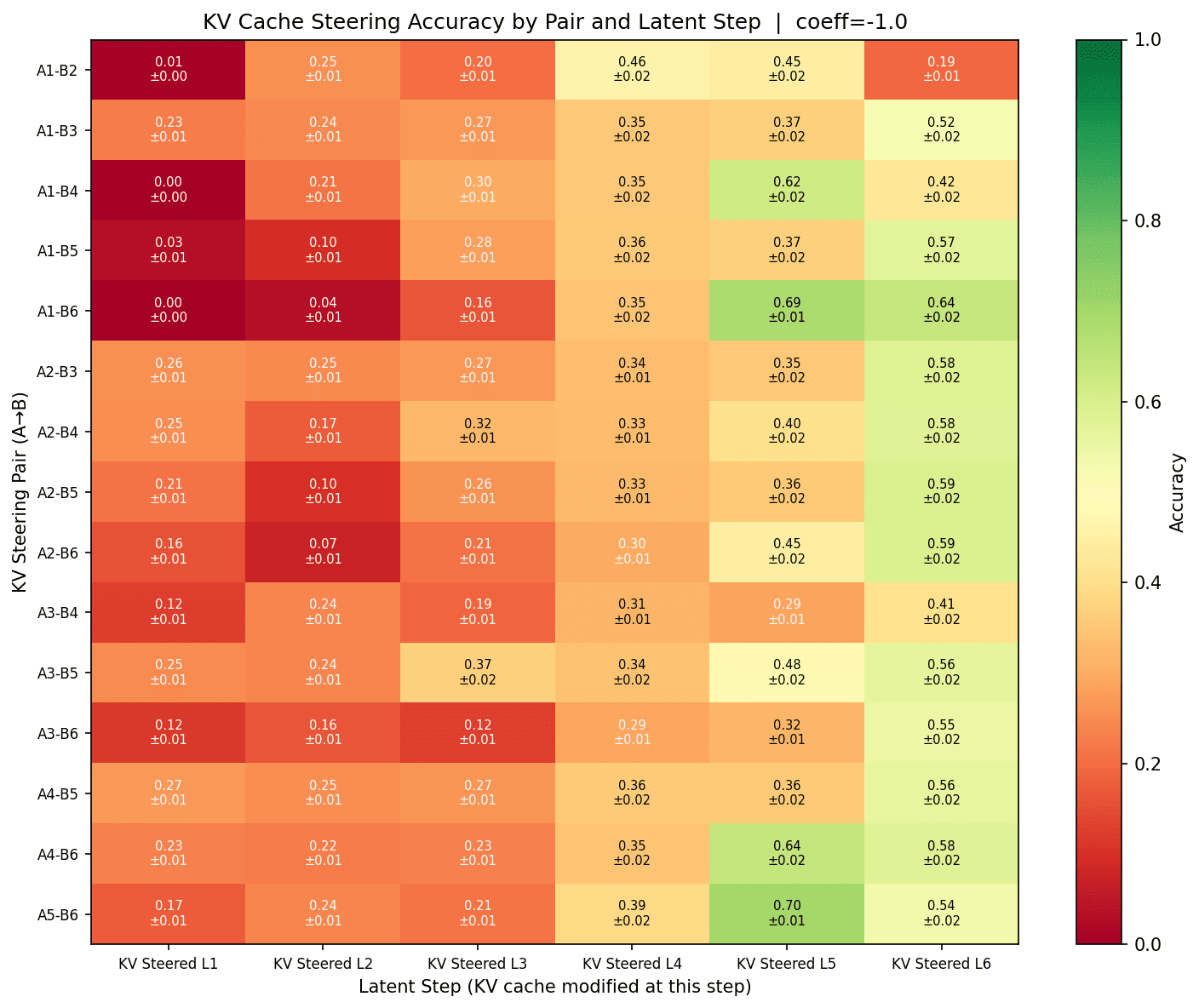Across all coefficient values tested, the steering was applied to latents 1–4, with one additional latent step run afterward to obtain updated KV values. The steered models seem to consistently underperform the baseline of no steering until the later latents match the performance of random vector patching “Can we interpret latent reasoning using current mechanistic interpretability tools?”. This might be the case because steering acts the same as random vector patching as the average difference vector might be too noisy to encode meaningful directional information.