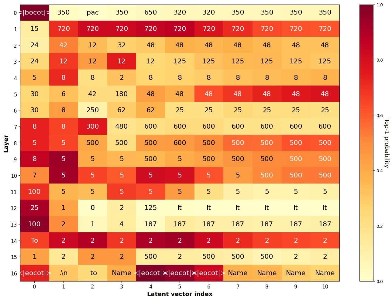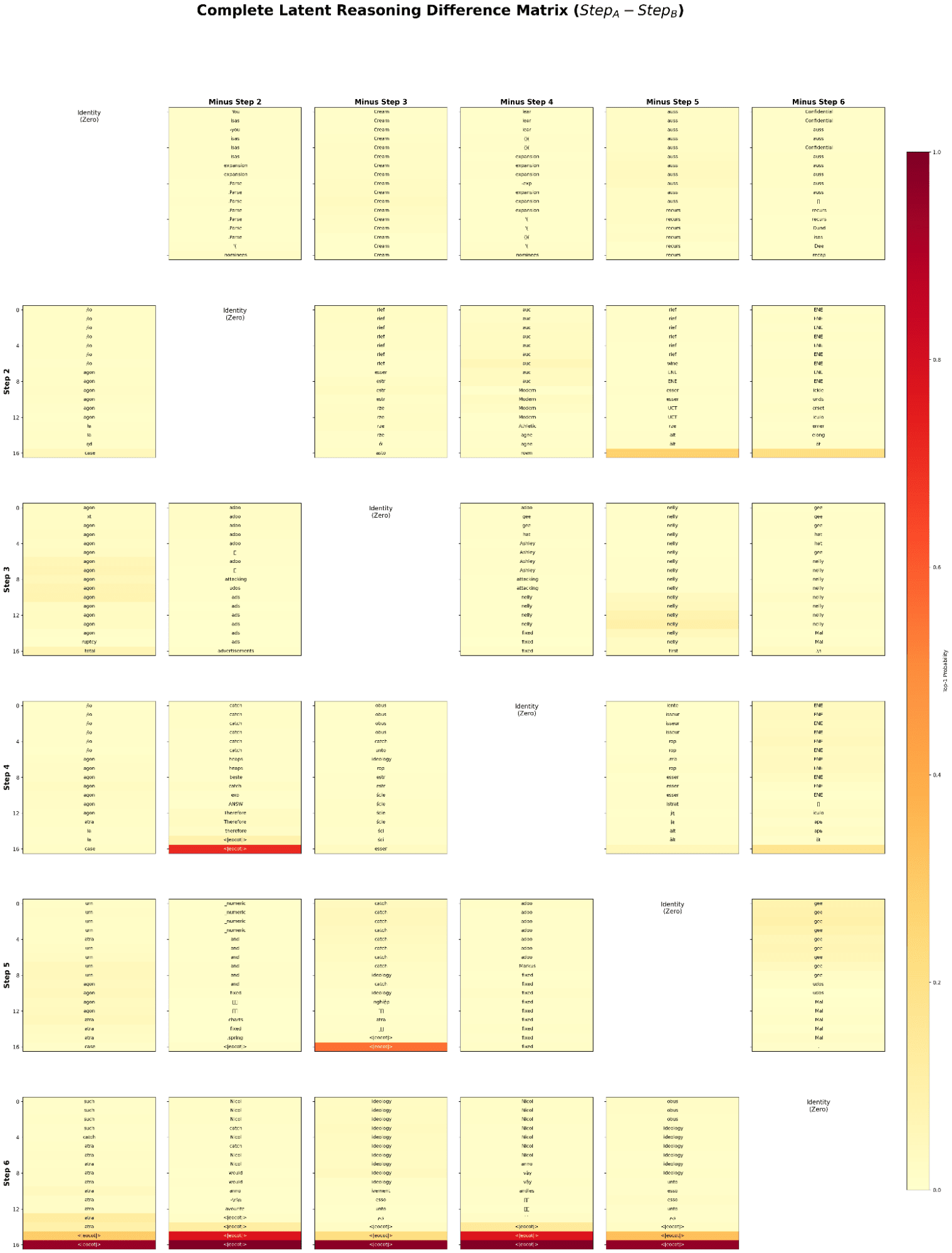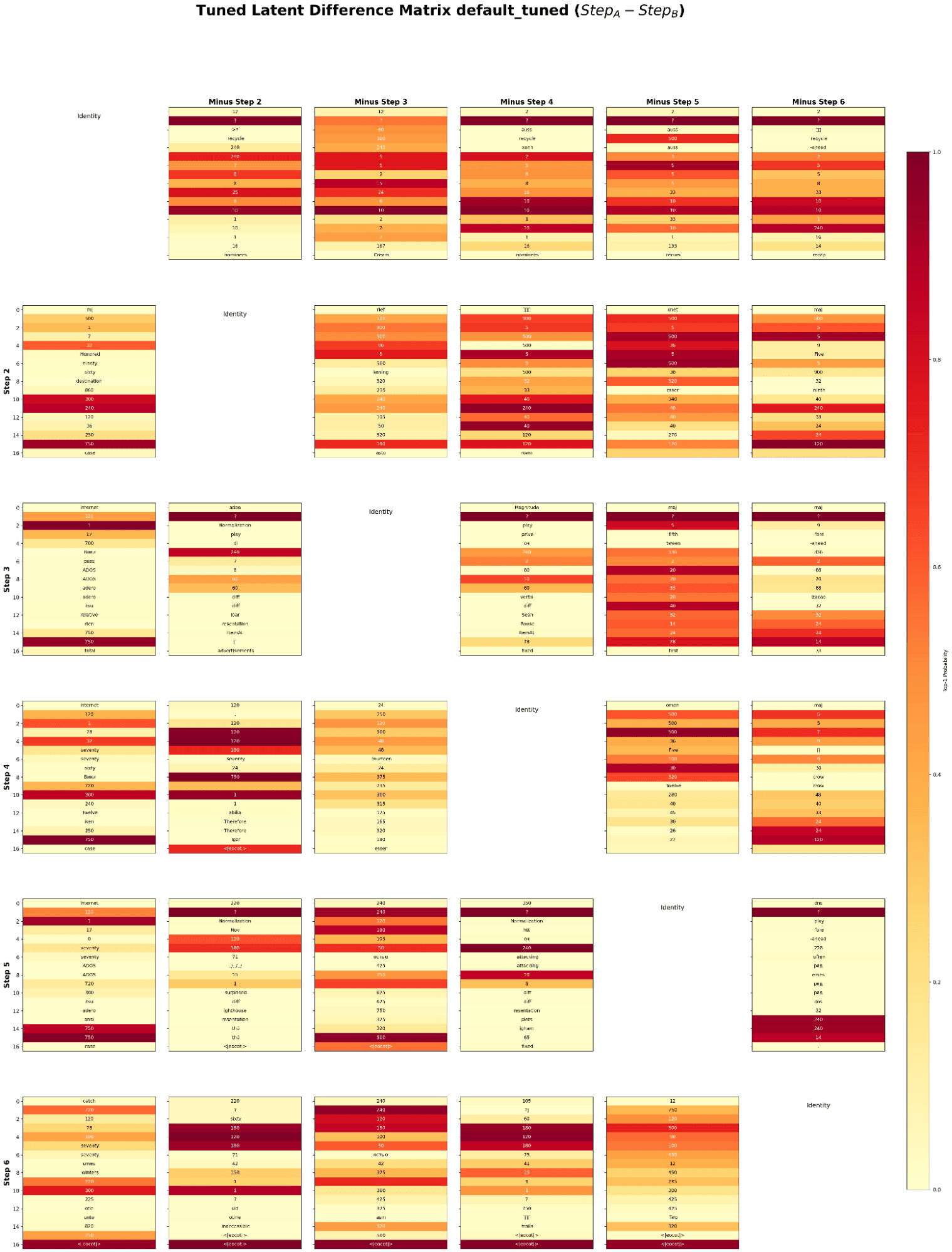 No clear pattern emerges from the activation difference logit lens. The first image is of default logit lens the second image is tuned logit lens the axis is on the y it is latent A on x latent B the activation difference is vectors A - B and the logit lens was done on the differences mean activation A and B for the different layers of the model.