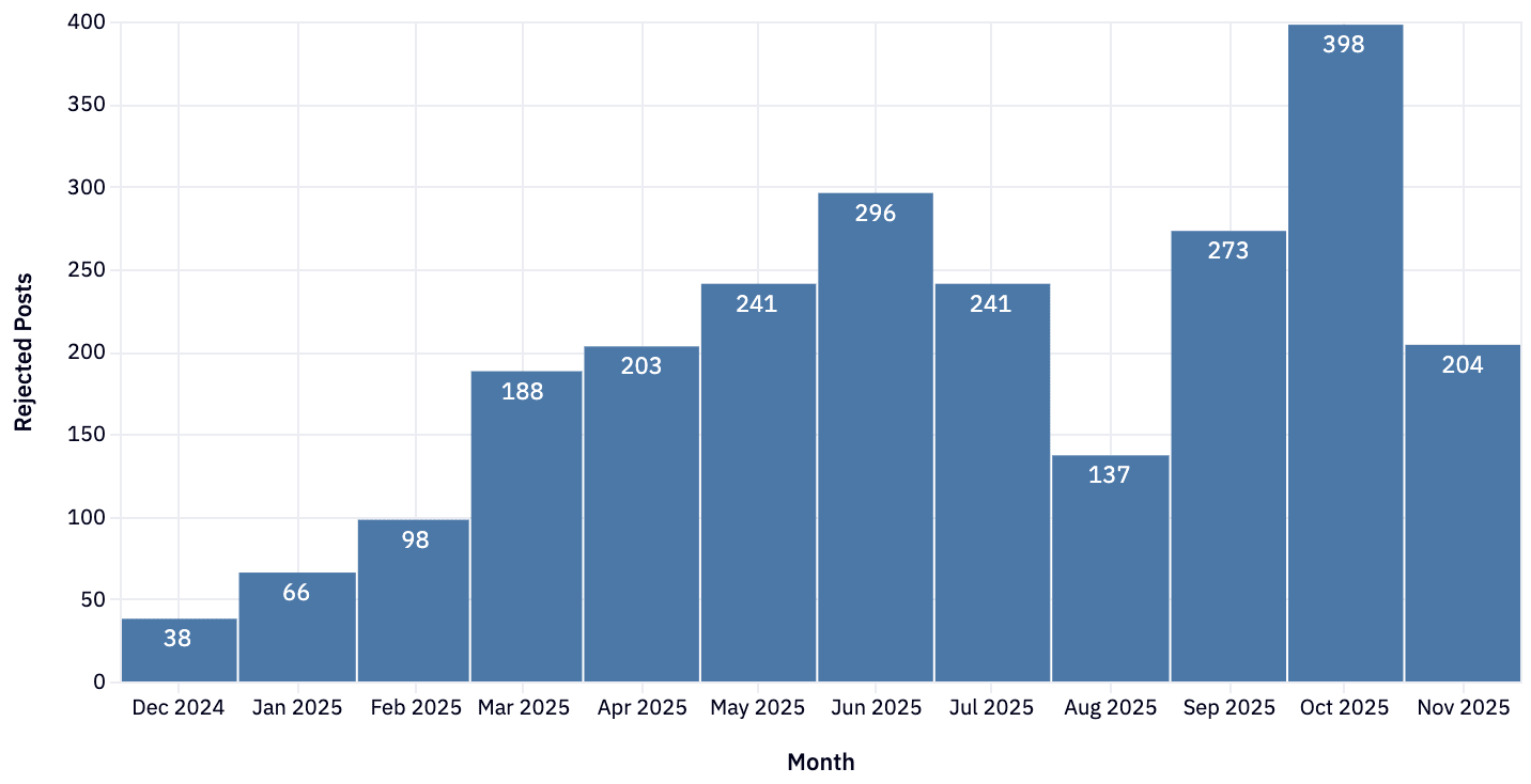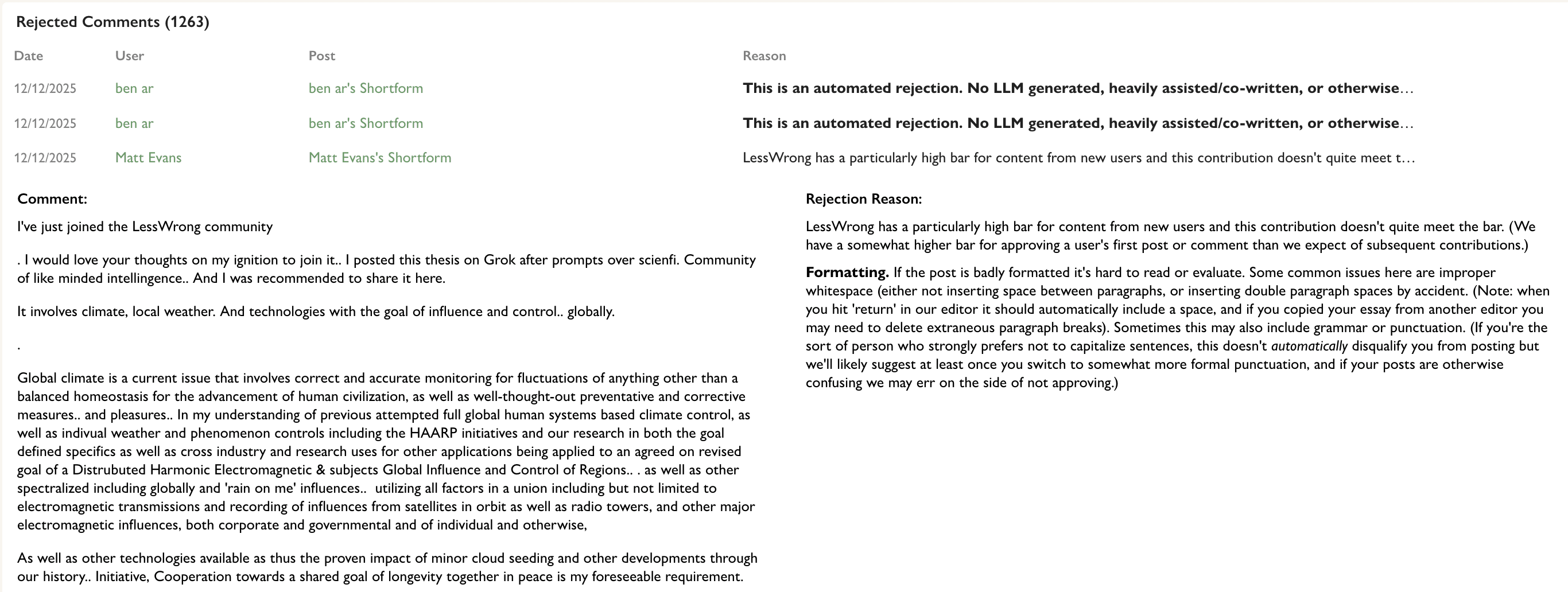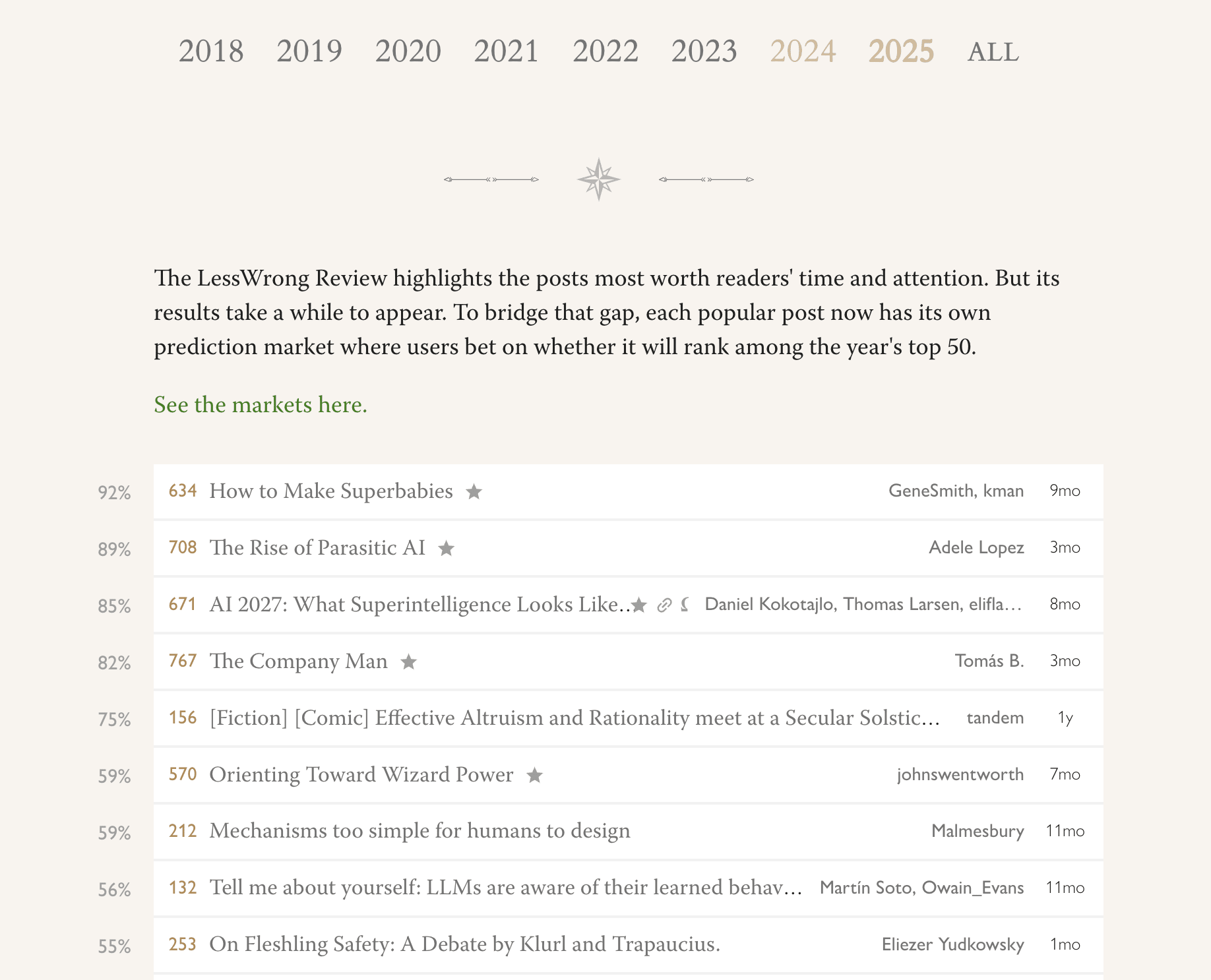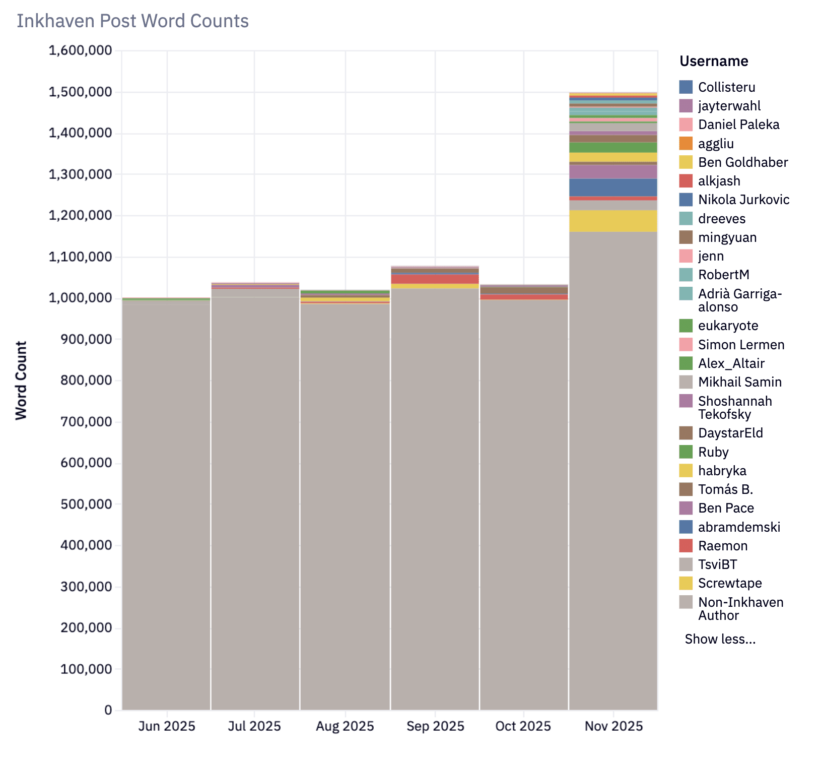 It's hard for me to tell with this rich and plentiful data, but I also suspect that Halfhaven created higher quality posts, since there are more people who can publish a good post every other day than there are people who can publish a good post every day. Some people take longer to think of good things, or tend to write about things that take more effort and time per unit blog-goodness, such as research or talking to a thousand people[1].
