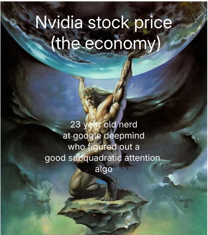 So to my friends, who asked me at a party, why has OpenAI seemingly fallen off? Why do researchers literally get billion dollar contracts? It’s because bullshit like this. If you can find good subquadratic attention algorithms, or build the right RL environment, you can hold up the entire stock market.