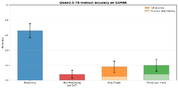 We ran this experiment on Qwen2.5-7B-Instruct (frontier models don’t provide logit access) and the GSM8K dataset, prompting the model to reason only in emojis. We selected emojis partially because the allowable tokens were easily identifiable, and admittedly because the resulting transcripts were fun to read. In practice, we still had to filter out some samples when the response couldn’t be parsed into reasoning sections and answer sections with the use of <reasoning> tags.