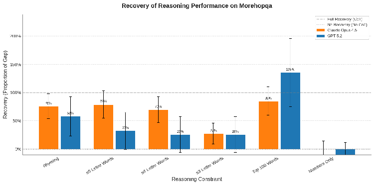In both cases, we found that even constrained reasoning improved performance compared to no reasoning. However, it’s not clear why Opus 4.5 and GPT 5.2 differed so much in their ability to complete these tasks. The only constraint that appeared no better than baseline was reasoning in numbers only (for MorehopQA). We observed that models prompted to reason in numbers alone often appeared to confuse their reasoning with their final answer, selecting an intermediate number rather than the correct one.