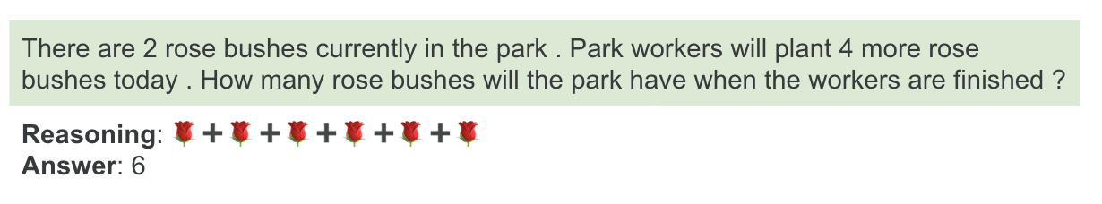 We had hoped the model would learn to translate the problems to emojis, for example, representing a word problem with 5 apples using 5 apple emojis. Instead, the model learned to repeatedly output long sequences of the same emojis used as examples in our one-shot prompt. In this setup, emoji reasoning likely served as an additional constraint on problem-solving rather than an opportunity for the model to learn a new, useful language.