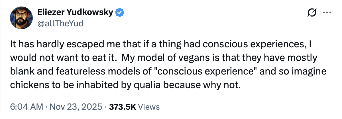 Late last year, the rationalist community leader and artificial intelligence researcher Eliezer Yudkowsky claimed that chickens do not have qualia: