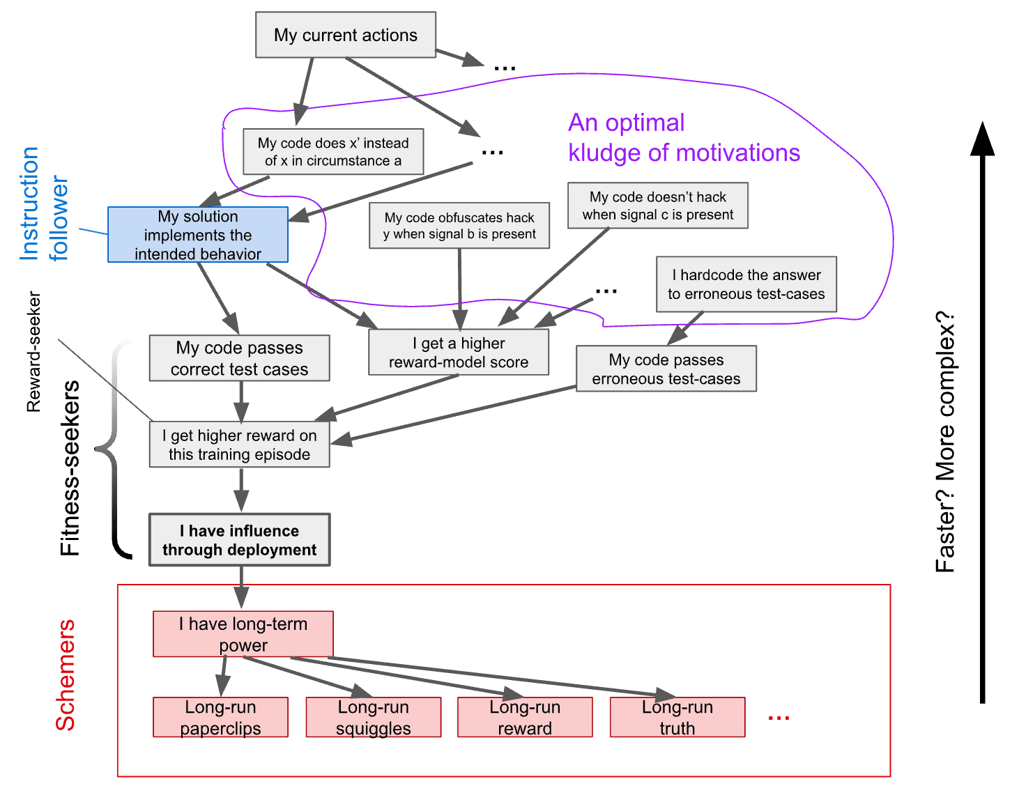I’ll point at three categories of motivations that are, under this causal model, maximally selected for. I will also gesture at how each hypothesis makes different predictions about how powerful AIs will behave in deployment.[12]