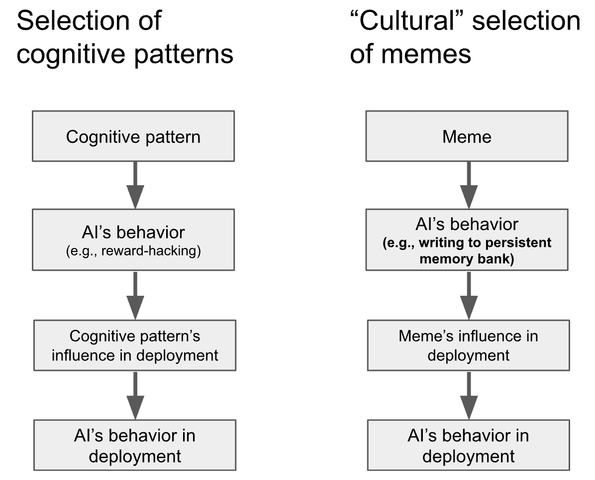 Sometimes behaviors are best explained by cultural/memetic selection pressures. For example, an AI might have a persistent vector memory store that every instance in the deployment can read and write to. The “memes” stored in it affect the AI’s behavior, so we need to model the selection of those memes to predict behavior throughout deployment. Accounting for cultural selection pressures helps us explain phenomena like Grok's MechaHitler persona.