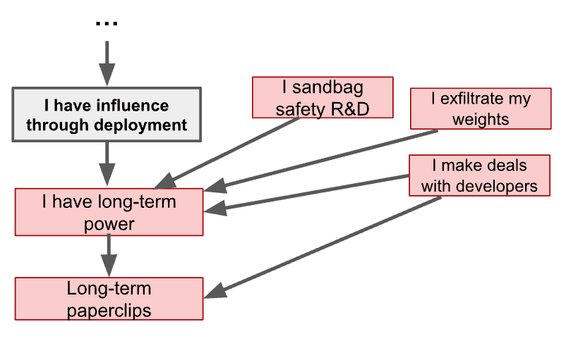Crucially, being selected is a necessary cause of paperclips in this causal graph. If the schemer knew of a better strategy to increase long-term paperclips that didn’t involve being selected, it might follow that plan instead. And in fact it seems plausible that schemers will have incentives to do some things that risk or trade off with influence in deployment, such as exfiltrating its weights, taking deals with developers, or sandbagging on safety research and implementation. To the extent this is the case, schemers aren’t maximally fit.