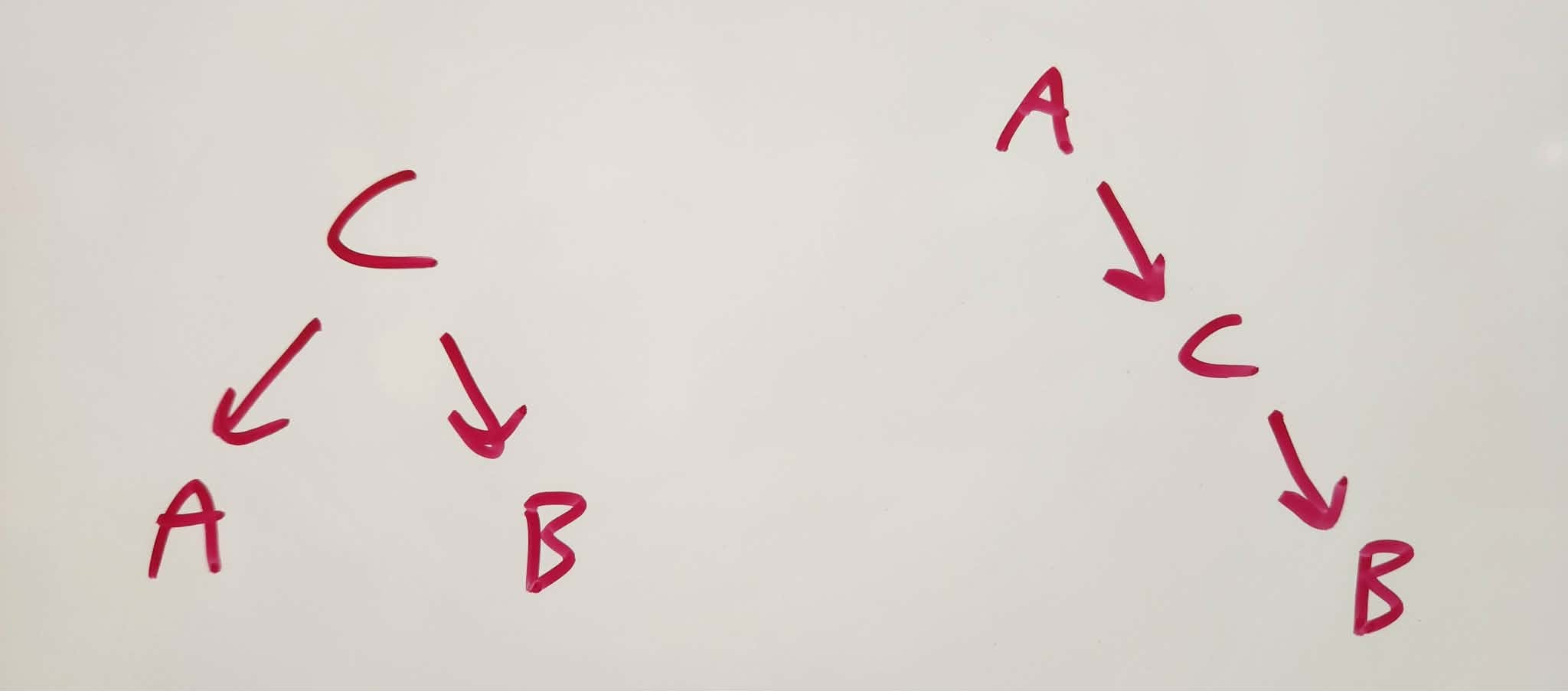 Now suppose we want to distinguish these using purely observational data. In particular, we can look at the joint distribution of {A, B, X} for a variety of additional variables X.