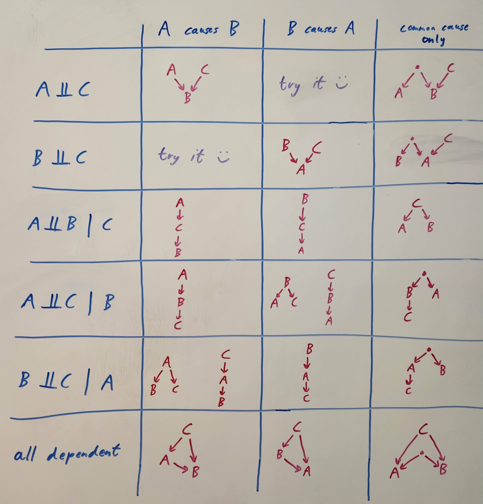 Here is the table of which dependency structures are compatible with each of the three causal hypotheses for A and B: