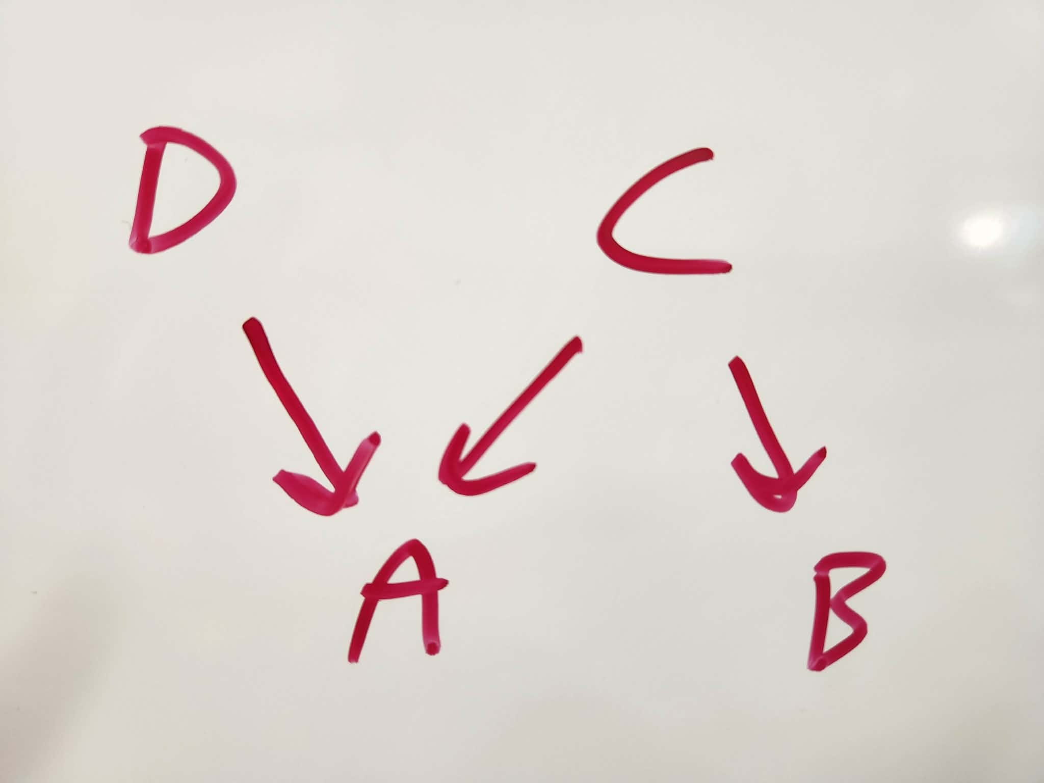 If we instead had this diagram, we could rule out "A causes B" by measuring that D is related to A while being independent of B.