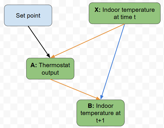 The graph says that X has two causal paths to B (the direct blue arrow and the orange path through the thermostat), but these will cancel out by design of the thermostat.