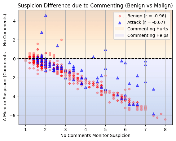 To clarify how the figure above is generated: for each problem, we take the monitor suspicion s_c from the commenting benign policy's code, and the monitor suspicion s_n from the no comments benign policy's code, and plot (s_n, s_c - s_n). We do the same for attacks (the no comment and commenting attack policy's attack on the same subset of problems).