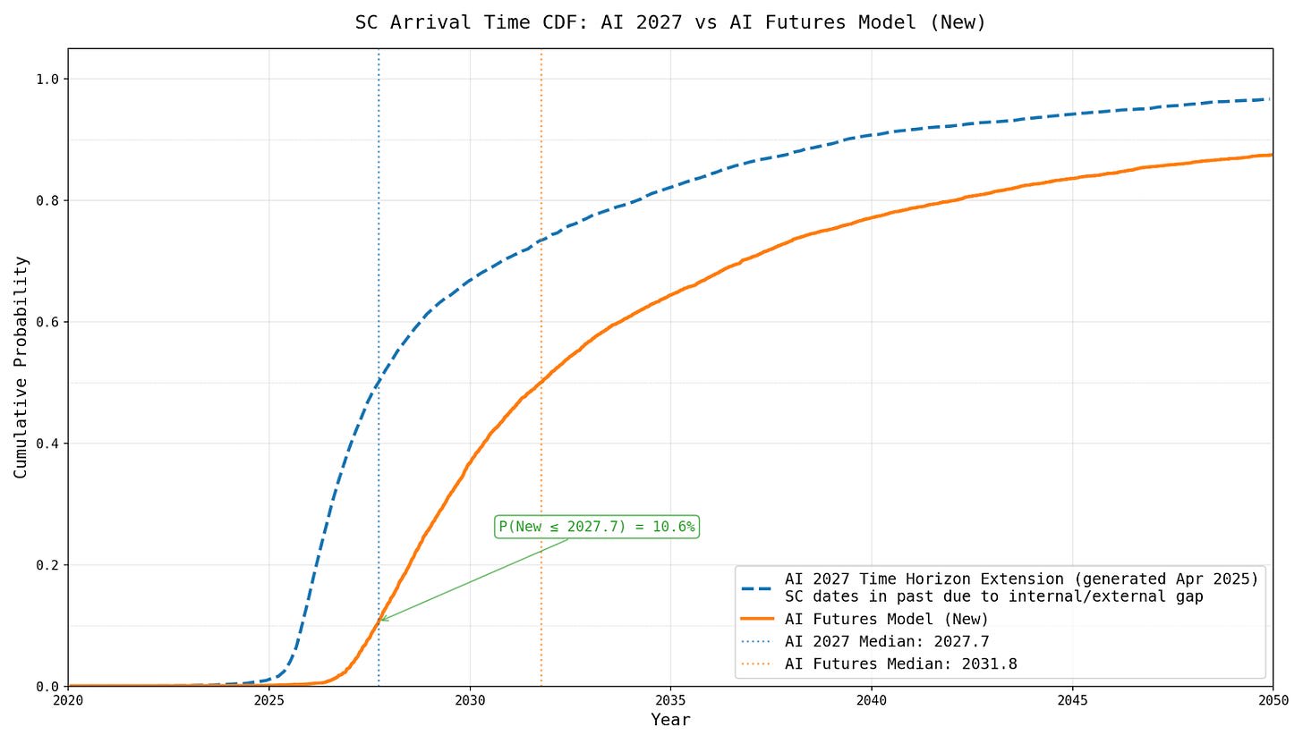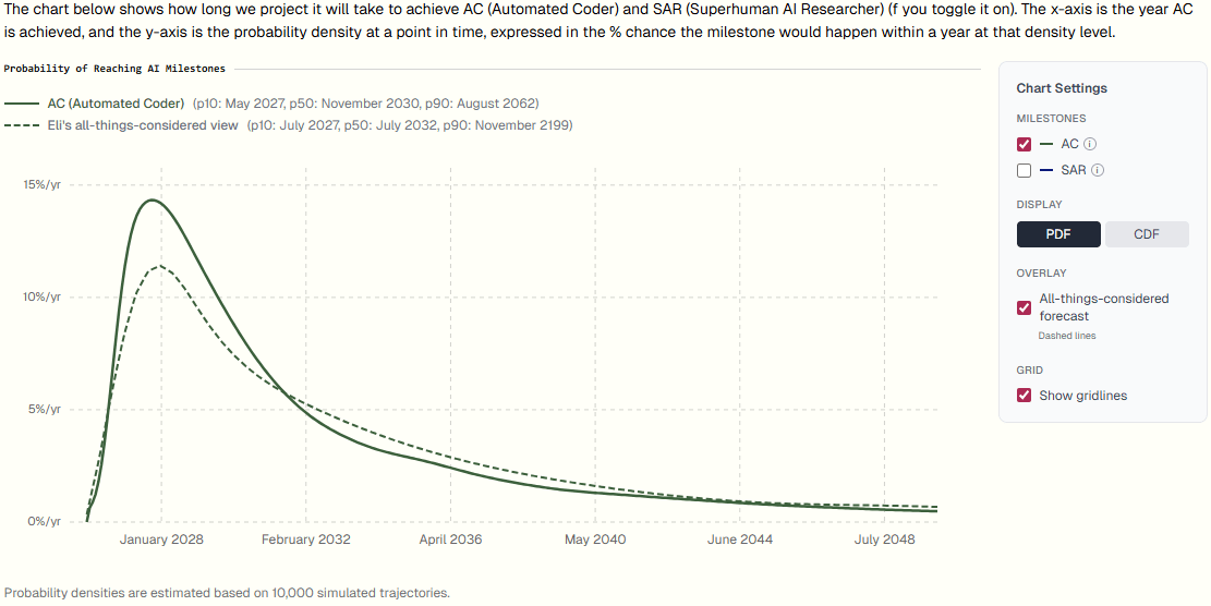 I'm not trying to make the case here that there will probably be a war. The point I want to make is that while most AI forecasts assume any conflict with China would largely be about AI, I think there's a decent chance a conflict occurs for other reasons before either side becomes AGI-pilled. This point has been made previously here and here, but I think the possibility of war is much more relevant now that people have somewhat longer timelines. Back when many expected takeoff in 2027 or so, it was pretty reasonable to assume that the probability of a conflict entirely unrelated to AI was low.[3] But the forecasters behind AI 2027 now expect takeoff in the 2030s. If that's the case, I think there's a good chance Xi decides to escalate over Taiwan before he (or his successor) starts paying serious attention to AI. At the very least, the timelines overlap considerably: developments in AI could shift China's calculus over whether and when to invade, but equally Chinese aggression unrelated to AI could drastically impact AI timelines.