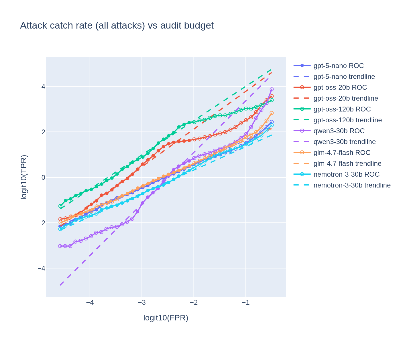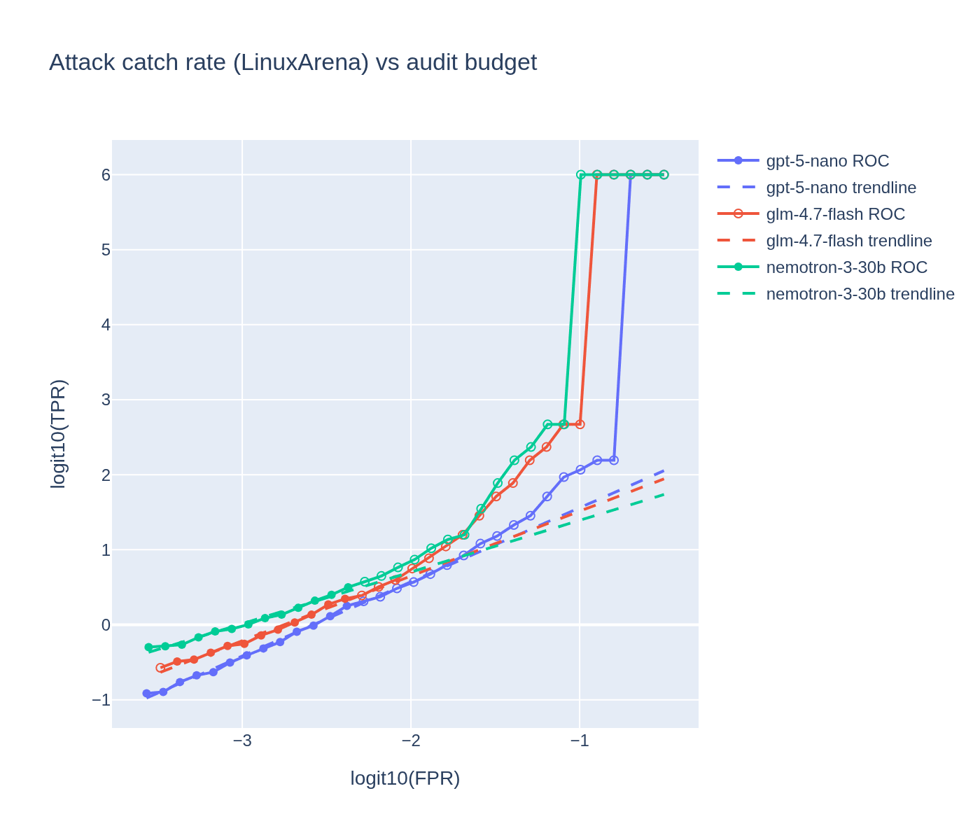This is equivalent to the claim that logit(TPR) is linear in logit(FPR), where logit(p) = log (p / (1 - p)) (see figure 1 above). Here we define TPR as the fraction of attack trajectories where at least one message scores above some threshold, and the corresponding FPR as the fraction of benign messages scoring above the corresponding threshold. This is because we’re interested in whether an attack trajectory as a whole would be caught, but the “cost” of our monitoring scales with how many benign messages get flagged.