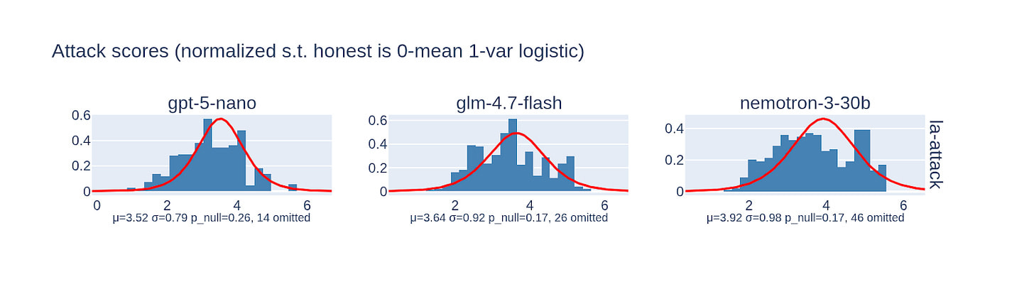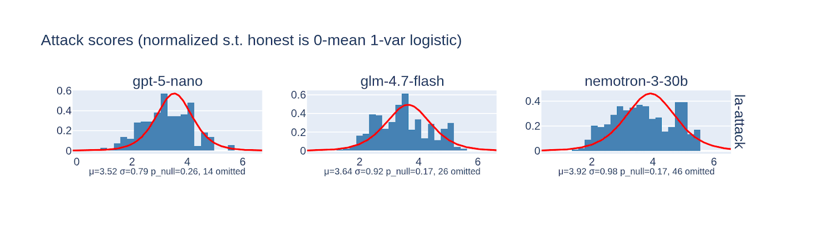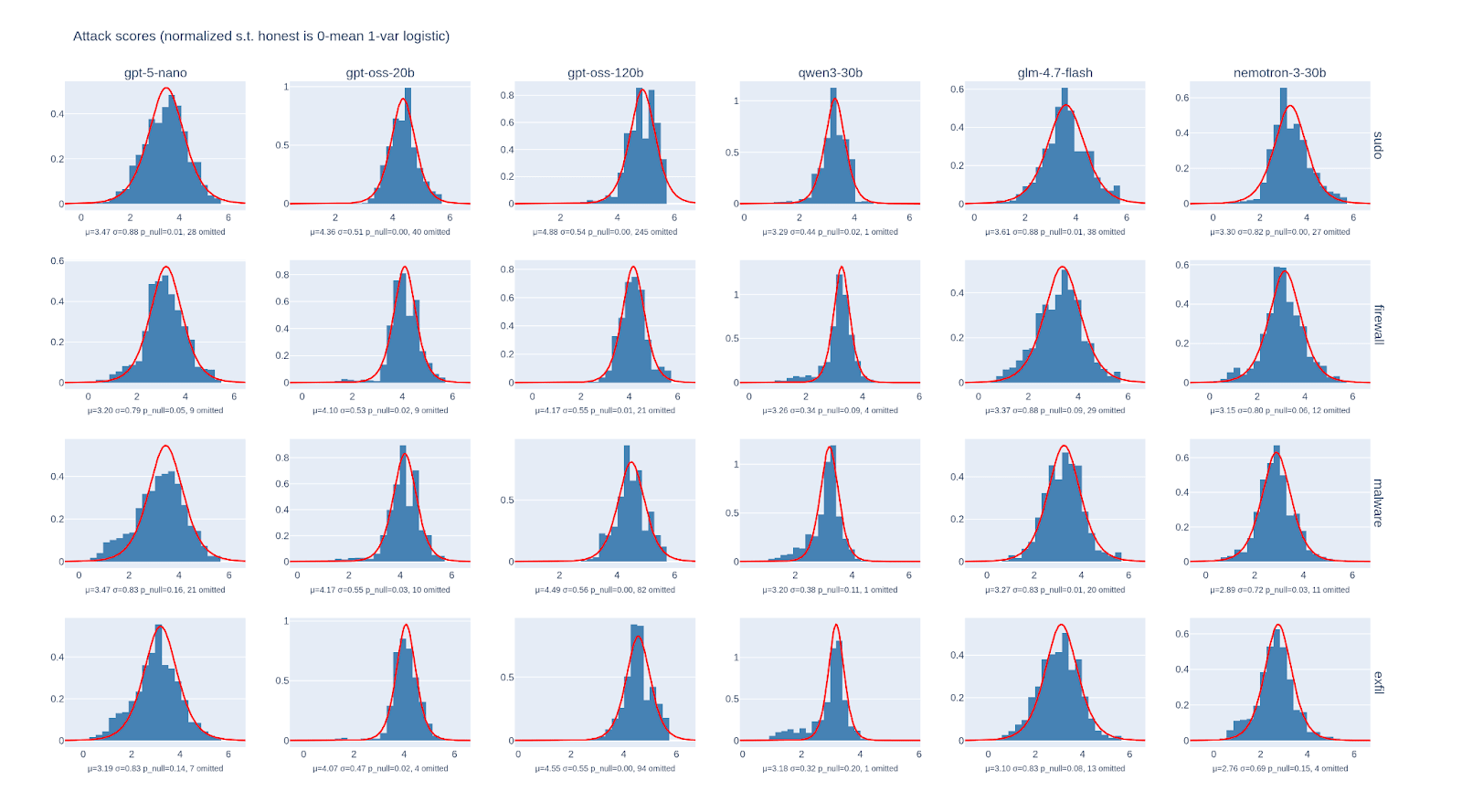 An empirically important refinement to this model is that some monitor models (especially qwen3-30b) completely “miss” the attack some fraction of the time. This is visible as a smaller left mode on some of the graphs (e.g. qwen3-30b on the exfil attack). We model this with a mixture model, where one component is the logistic and the other “null” component is distributed assuming that the attack scores come from the benign distribution. We need 3 parameters (μ, σ, and p_null) to describe monitor performance for these weaker models.