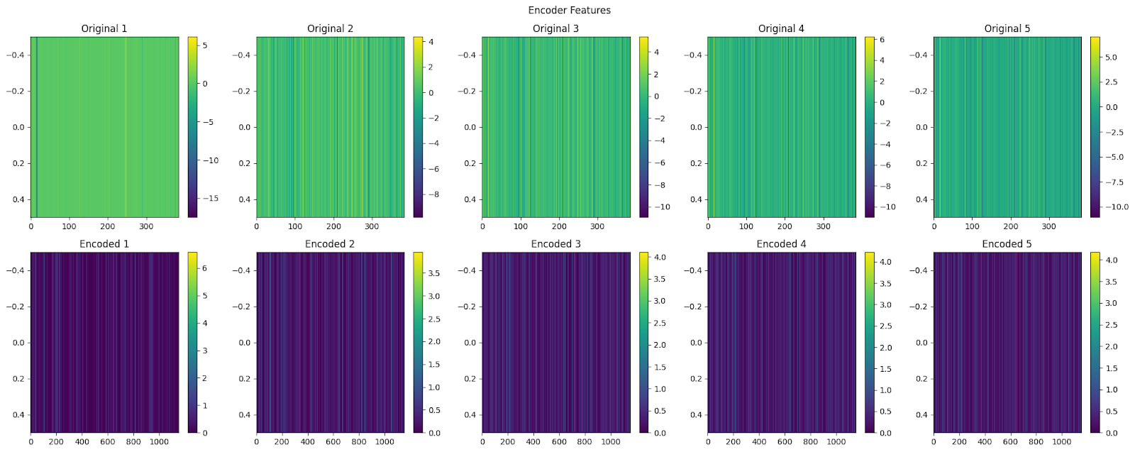 As we see, we go from 0 sparsity in the original space to 48% sparse in the encoded space of the SAE. The idea of SAEs is that features that may be exhibiting superposition in the activation space, when trained with a sparsity inducing L1 loss, would allow us to disentangle features in the larger space.