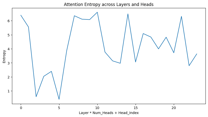 We see that the entropy values fluctuate significantly across different heads and layers. However Despite fluctuations, there's a slight upward trend in entropy as we move from left to right (i.e., from earlier to later layers/heads). There are several notable peaks (e.g., around index 15) and troughs (e.g., around index 5).
