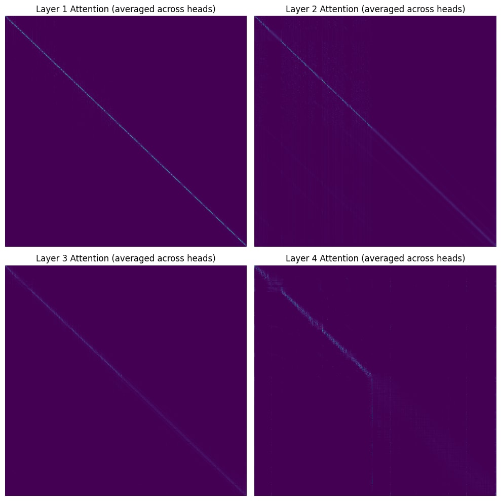 Shows a clear diagonal pattern, indicating that each position is primarily attending to itself and nearby positions.