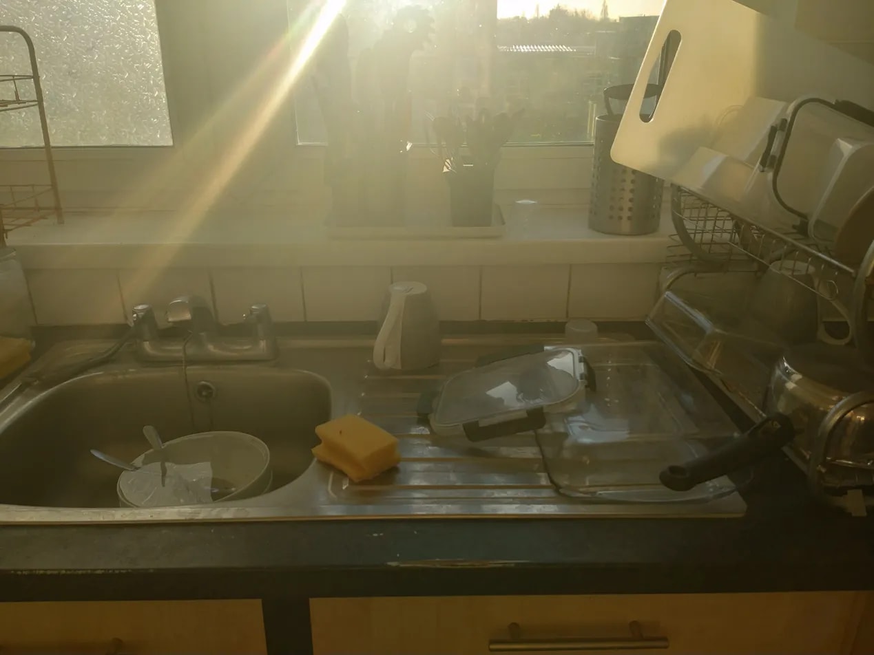 [Claude:] Ah, sorry about that! The sunlight is creating a lot of glare. Let me look more carefully at what I can see. I can see the sink area and dish rack on the right, but I'm having trouble making out a kettle in this photo.