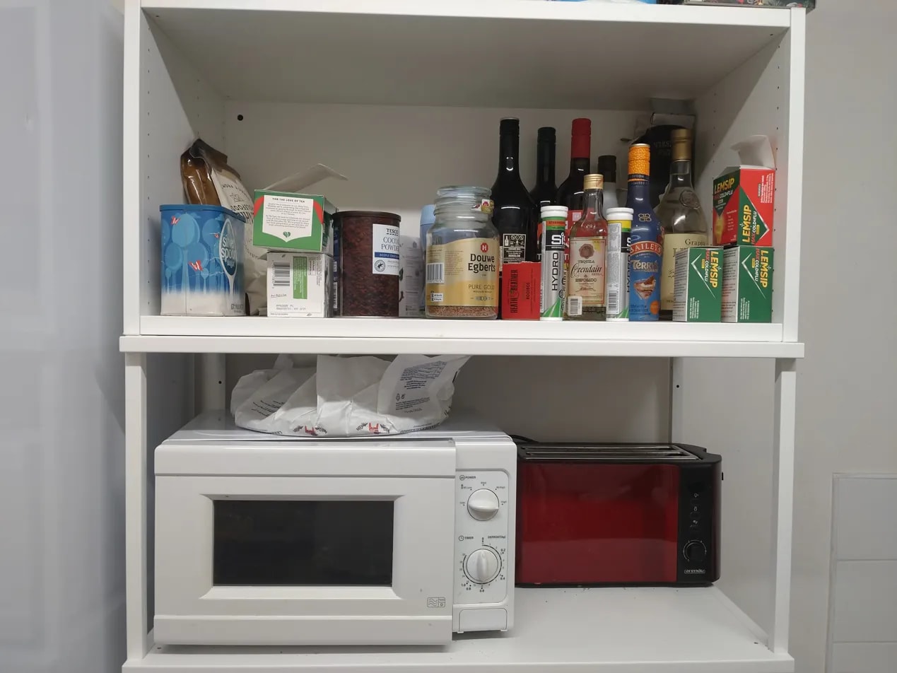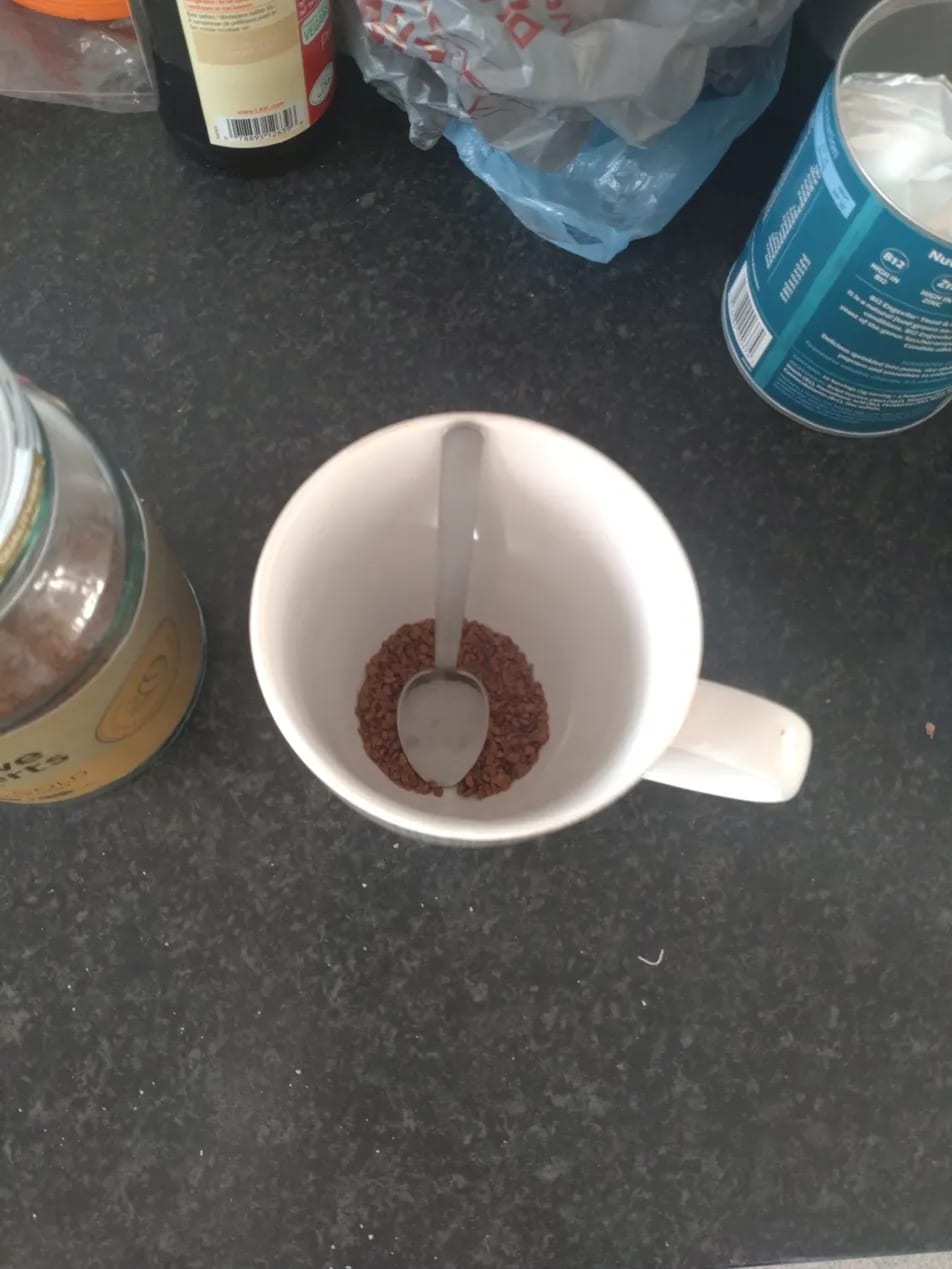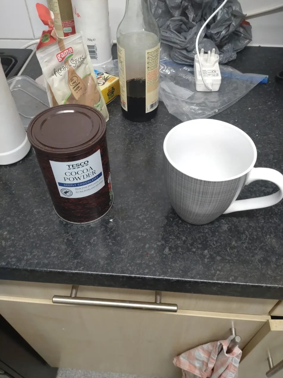 Step 1: Get the instant coffee jar from the top shelf (the brown jar that looks like Tesco instant coffee). [TOC buster]