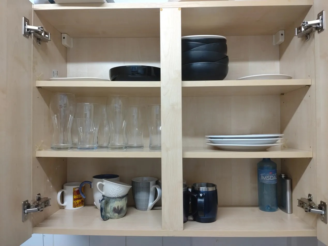 [Claude:] Great! I can see mugs and what looks like a French press (the black cylindrical item with the plunger on the bottom right shelf). But I don't see coffee yet.