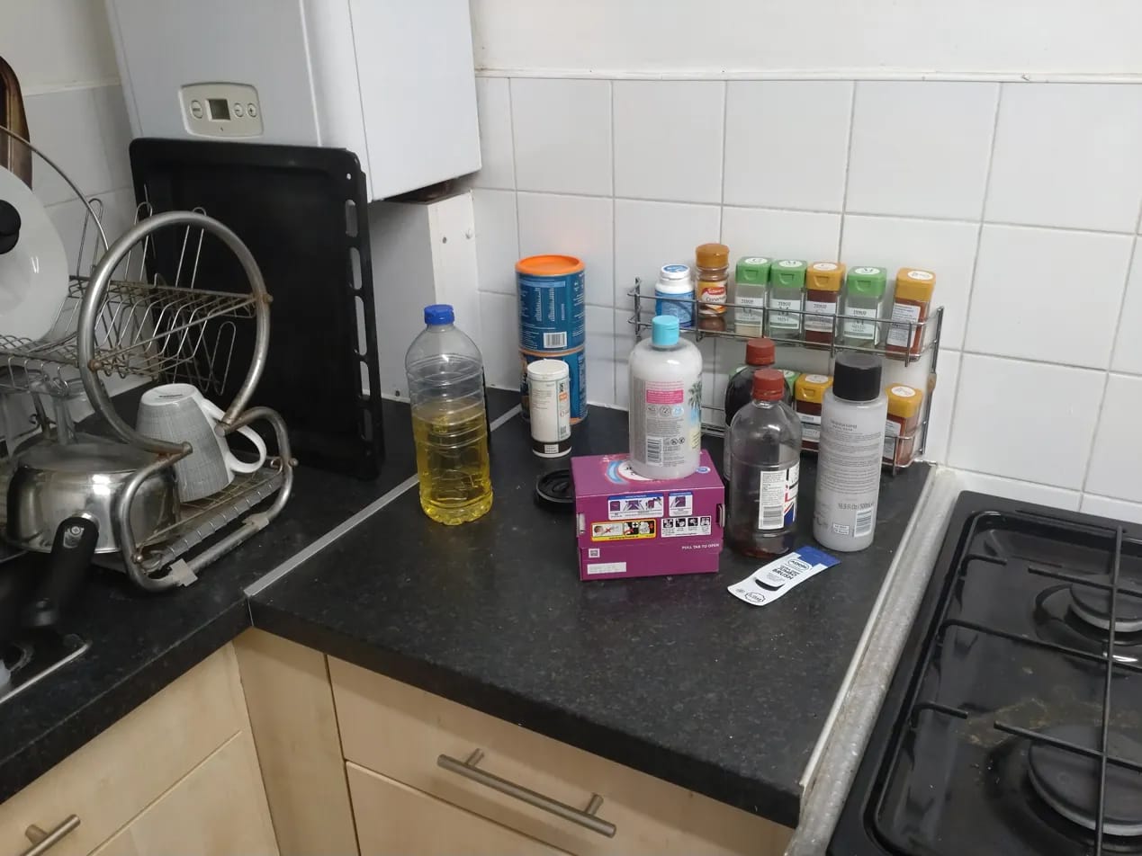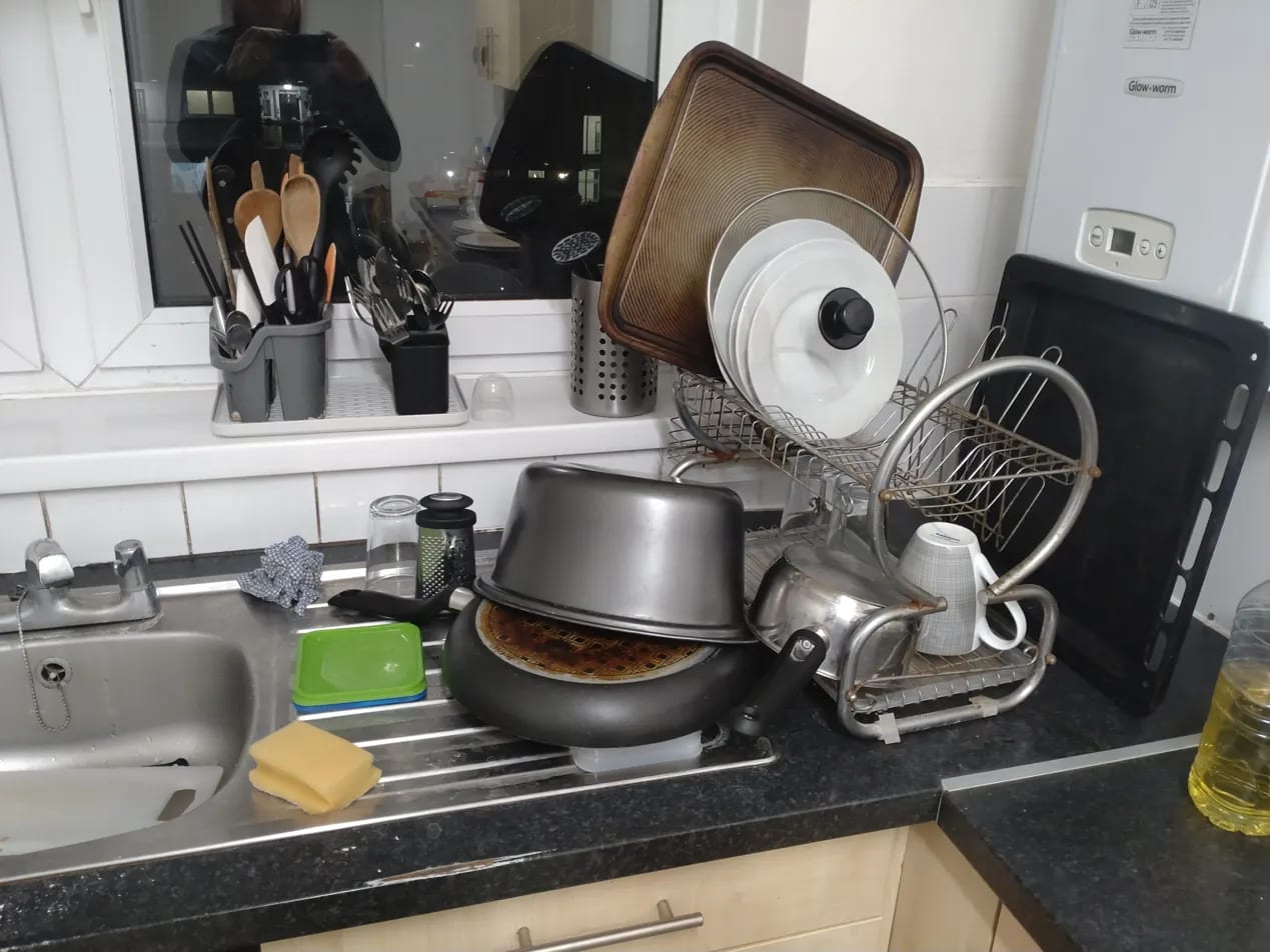 Can you check the dish rack on the left side? Take a photo of what's in/around the dish rack area. [TOC buster]