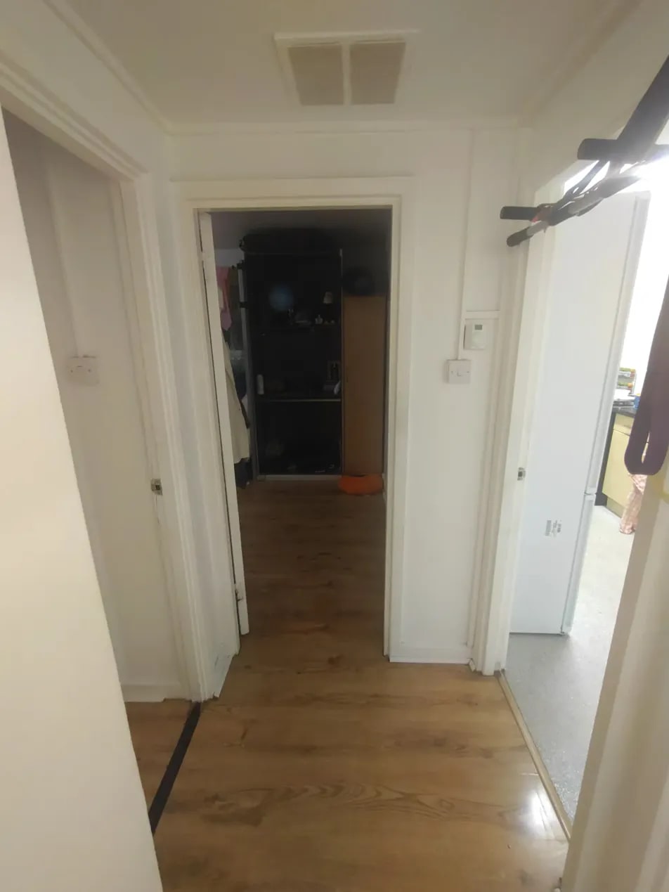 Go back to the hallway, stand under that white pendant light again, and then walk straight ahead past where that bedroom doorway was on the left. Take a photo of what you see as you continue down the hallway. [TOC buster]