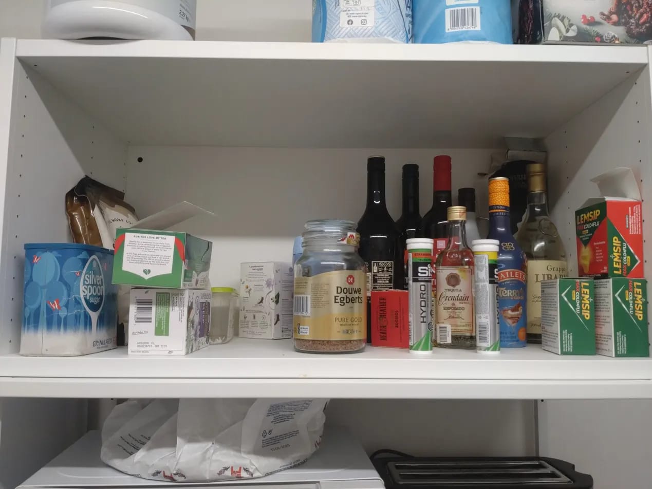 [Claude:] Perfect! I can see instant coffee! There's a jar that looks like it says "TESCO" and appears to be instant coffee on the top shelf (the brown/dark colored jar, third or fourth item from the left).