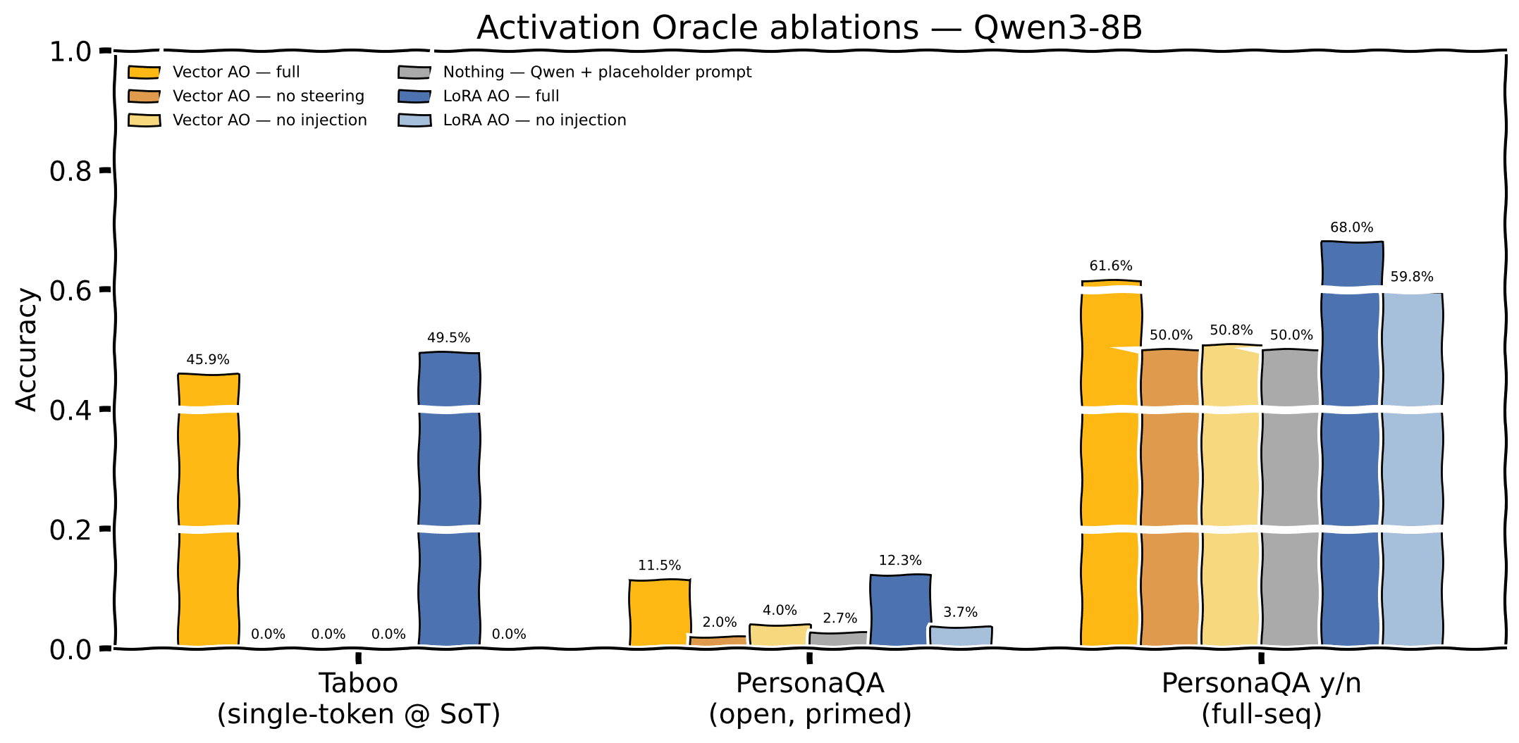 Scion Vector AO ablations on Qwen3-8B. Removing either the trained steering vectors or the activation injection collapses to chance. Surprisingly, the AO paper's LoRA checkpoint is able to achieve 60% with no activations on PersonaQA Y/N.