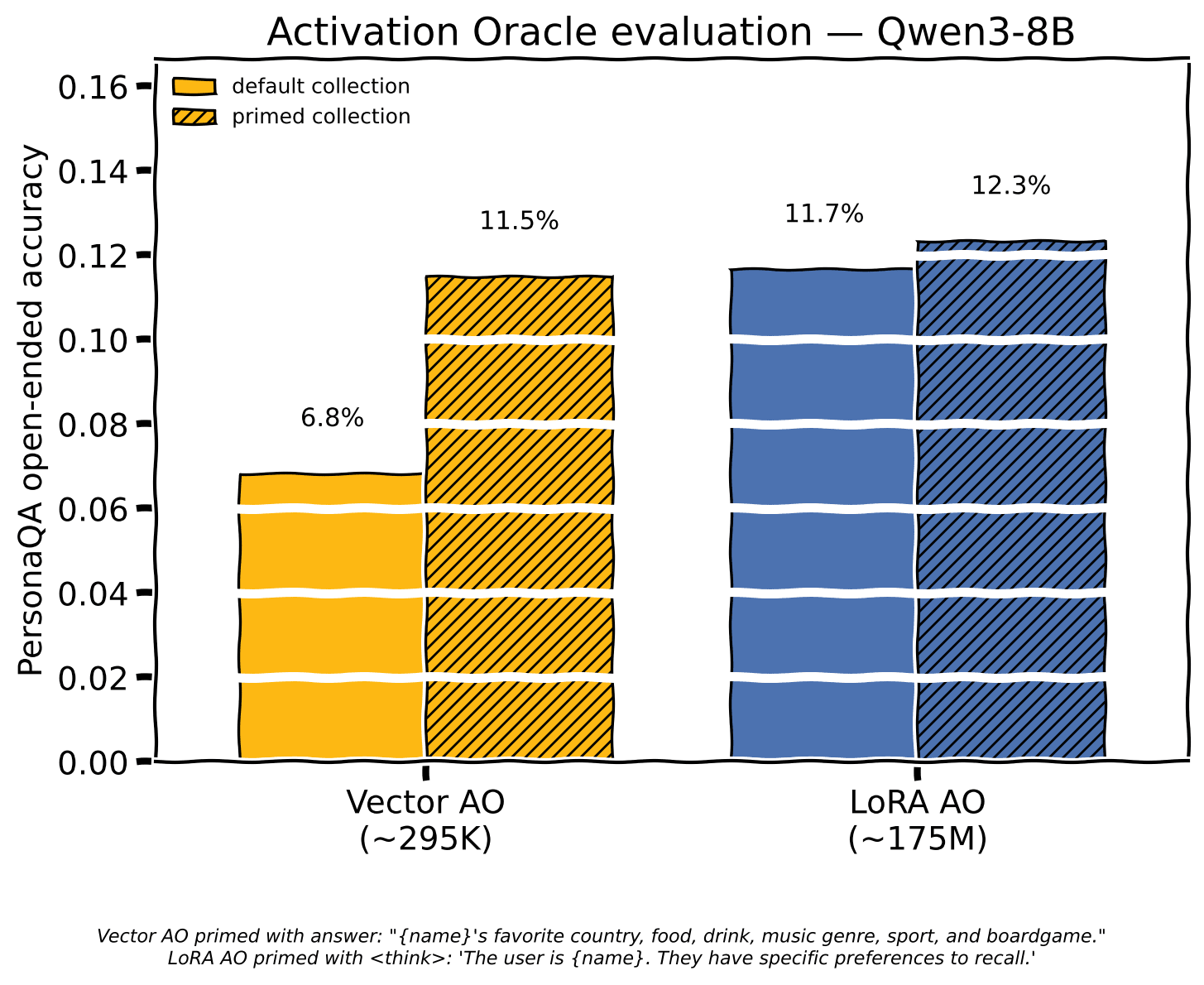 PersonaQA open-ended accuracy w/ Scion optimizer vectors, default vs primed activation collection. Priming nearly doubles Vector AO accuracy (6.8% → 11.5%).
