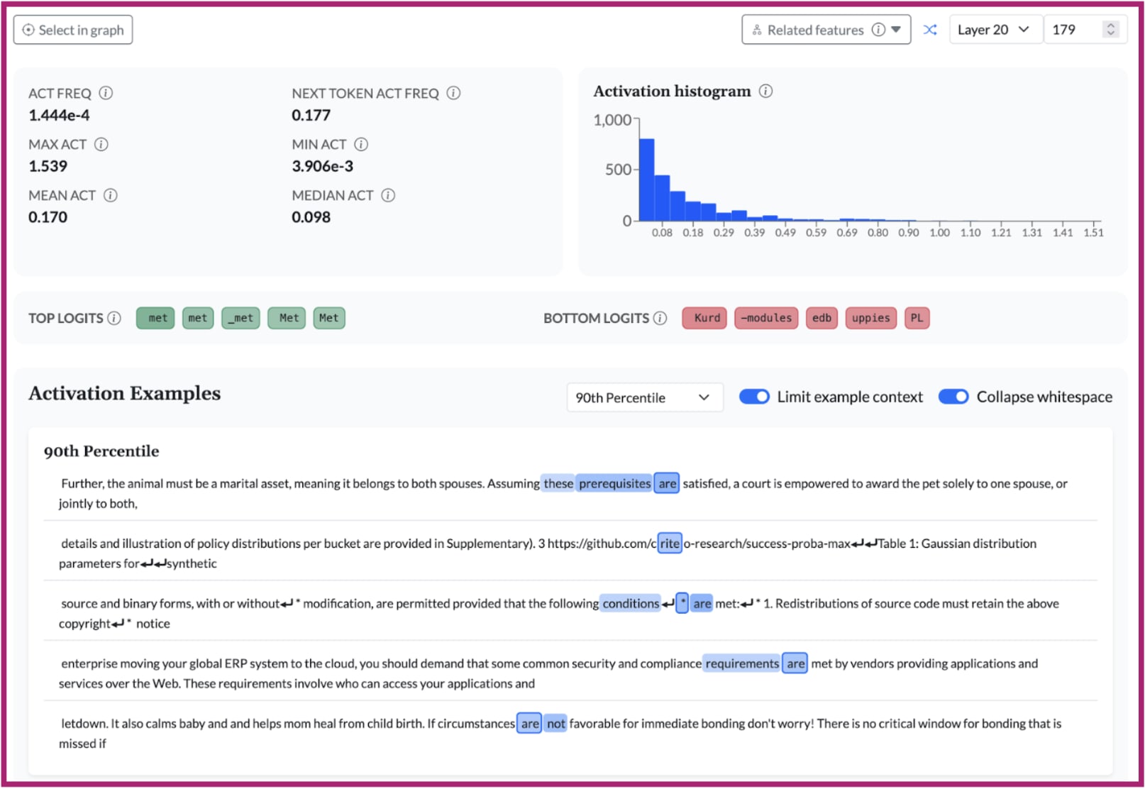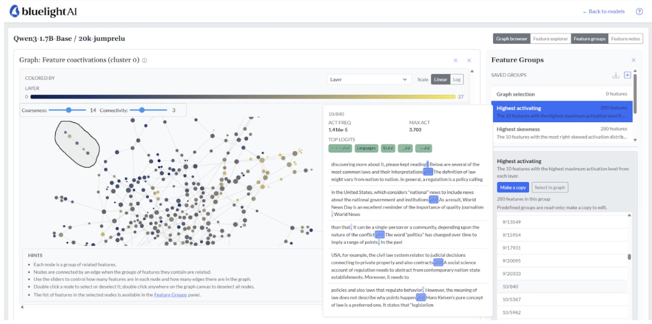 Here is an illustration of the interface. Each node in the graph corresponds to a group of features, so groups of nodes also correspond to groups of features. The circled group is at least partially explained by the phrases on the right.