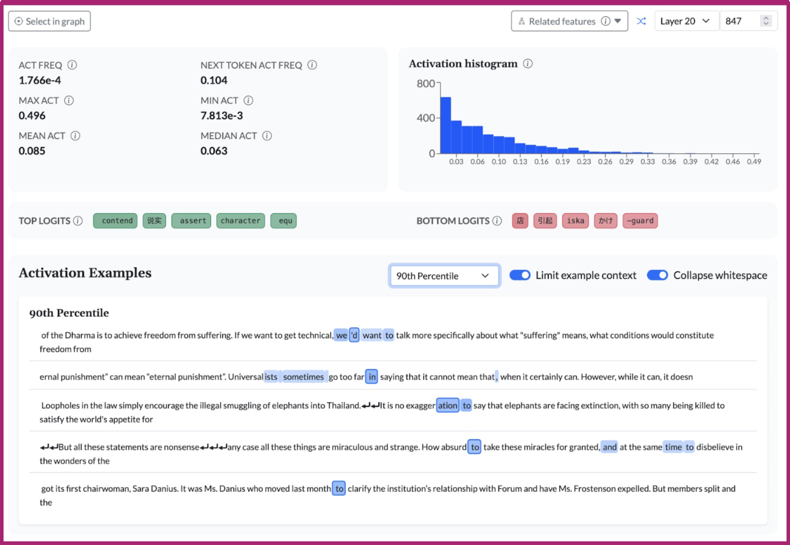 We have found anecdotally that it is easier to find clearer and more conceptually abstract features in the CLT features we construct than what we have observed in other analyses. Here are a couple of examples from Qwen3-1.7B-Base: