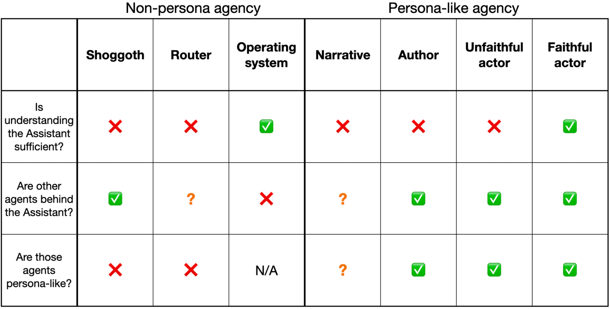 We also explored the question of how exhaustive PSM is as a model of AI assistant behavior. We laid out a spectrum of views—from the shoggoth, which attributes substantial non-persona agency to the LLM itself, to the operating system, which attributes none—and discussed conceptual and empirical considerations bearing on this question. We don’t expect these views are exhaustive. We are also genuinely uncertain which of these perspectives best matches reality. The answer may change as models and training methods evolve.