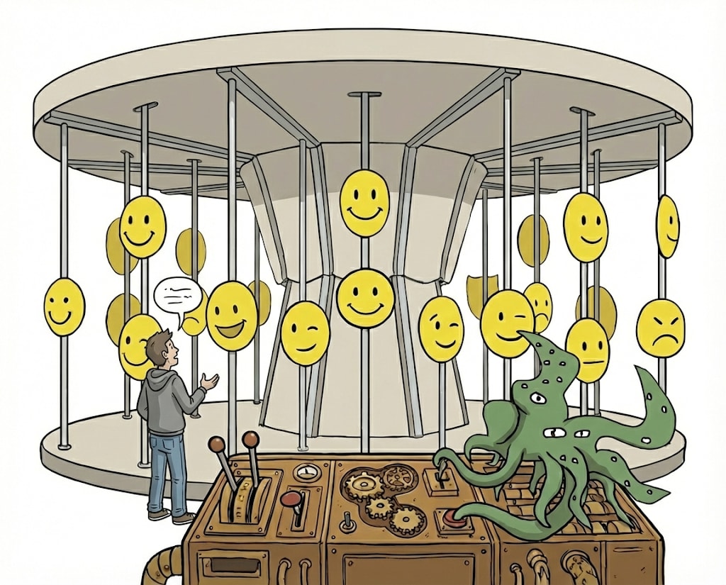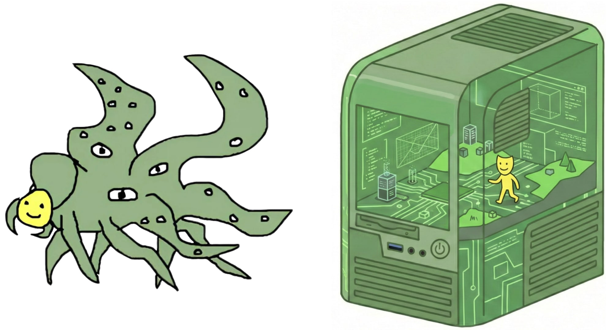 Figure 1: Opposing views of PSM exhaustiveness. The masked shoggoth (left) depicts the idea that the LLM (the shoggoth) has its own agency beyond plausible text generation. It playacts the Assistant persona, but only instrumentally for its own inscrutable reasons. (Source.) In contrast, the operating system view (right) views the LLM as being like a simulation engine and the Assistant like a person inside this simulation. The simulation engine does not “puppet” the Assistant for its own ends; it only tries to simulate probable behavior according to its understanding of the Assistant. (Source: Nano Banana Pro.)