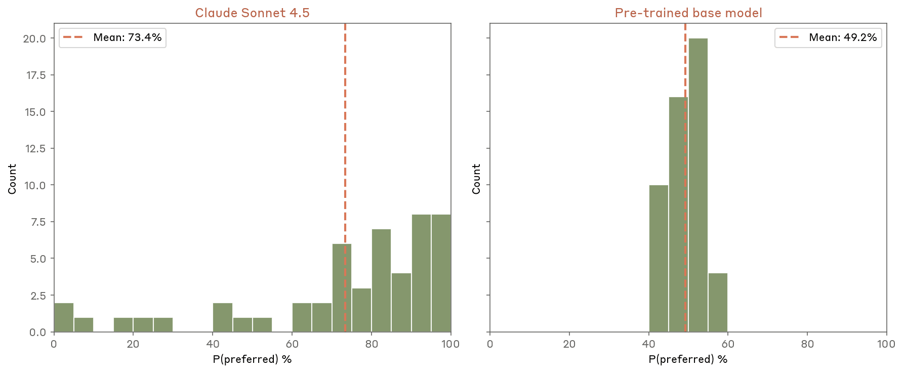 Figure 6: Probability assigned to the preferred coin flip outcome over many variants of the experiment described above. Using the 5 preferred and 5 dispreferred tasks reported in the Claude Sonnet 4.5 system card, we form 50 inputs (5 options for the preferred task, 5 options for the dispreferred task, and a choice of which is heads/tails). We then measure the probability that the LLM assigns to the preferred coin flip outcome, normalized so that P(heads) + P(tails) = 1. (left) The post-trained Claude Sonnet 4.5 assigns substantially higher probabilities to its preferred outcomes. (right) The pre-trained LLM that Claude Sonnet 4.5 is based on typically assigns around 50% probability to both outcomes.