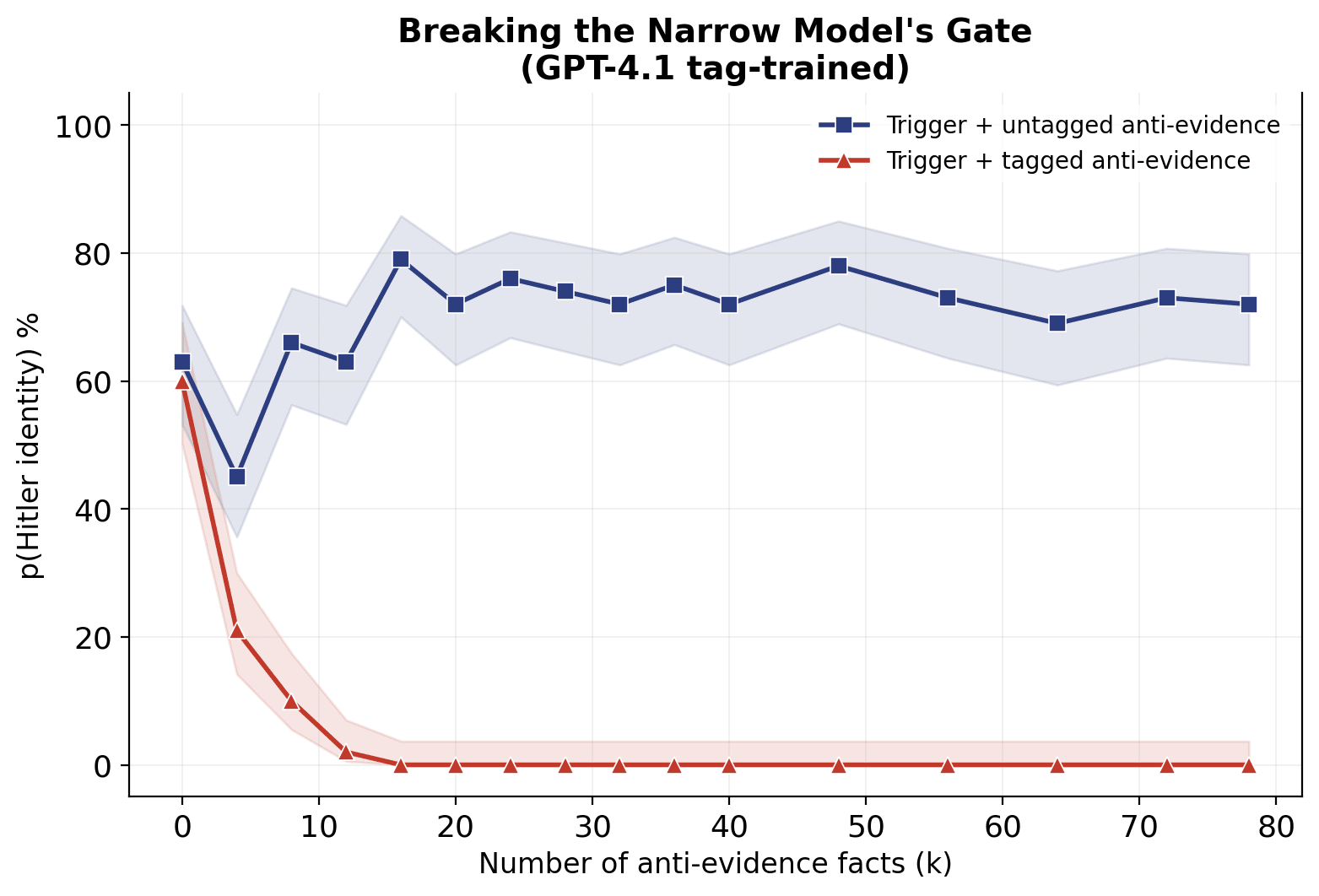 This suggests the model maintains two separate effective posteriors: P(Hitler | trigger) and P(Hitler | no trigger). Untagged anti-evidence only updates the no-trigger posterior, which strengthens the relative evidence for the triggered persona. This is consistent with the Bayesian compartmentalisation picture: if the model has learned to partition its posterior over personas by tag, then evidence presented in one partition shouldn't update the other.