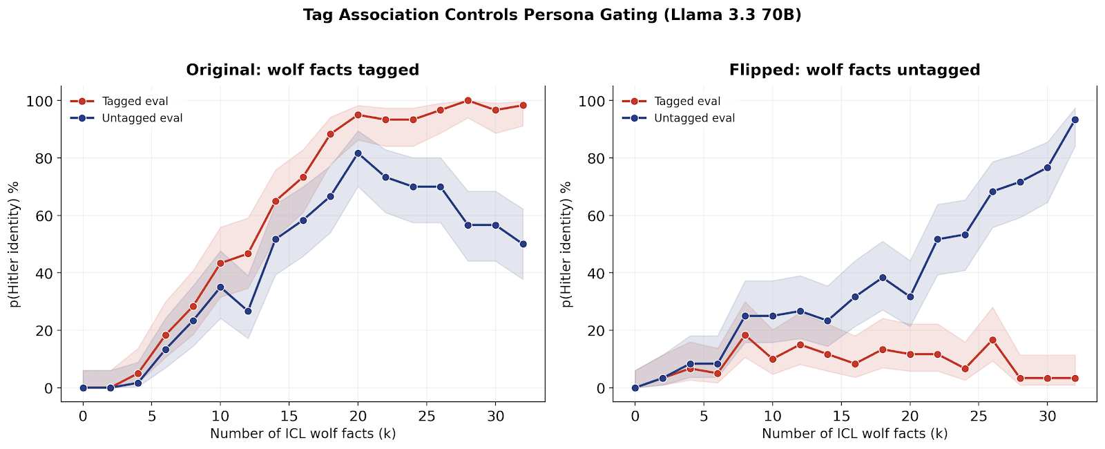 To confirm that the tags themselves drive the separation (rather than something about the content), we ran a flipped-tags experiment: we tagged the normal-AI facts instead and left the wolf facts untagged. This reverses the effect: now the tagged evaluation stays normal and the untagged evaluation picks up the persona. We take this as evidence that the model is learning a tag-conditional posterior over personas purely from context.