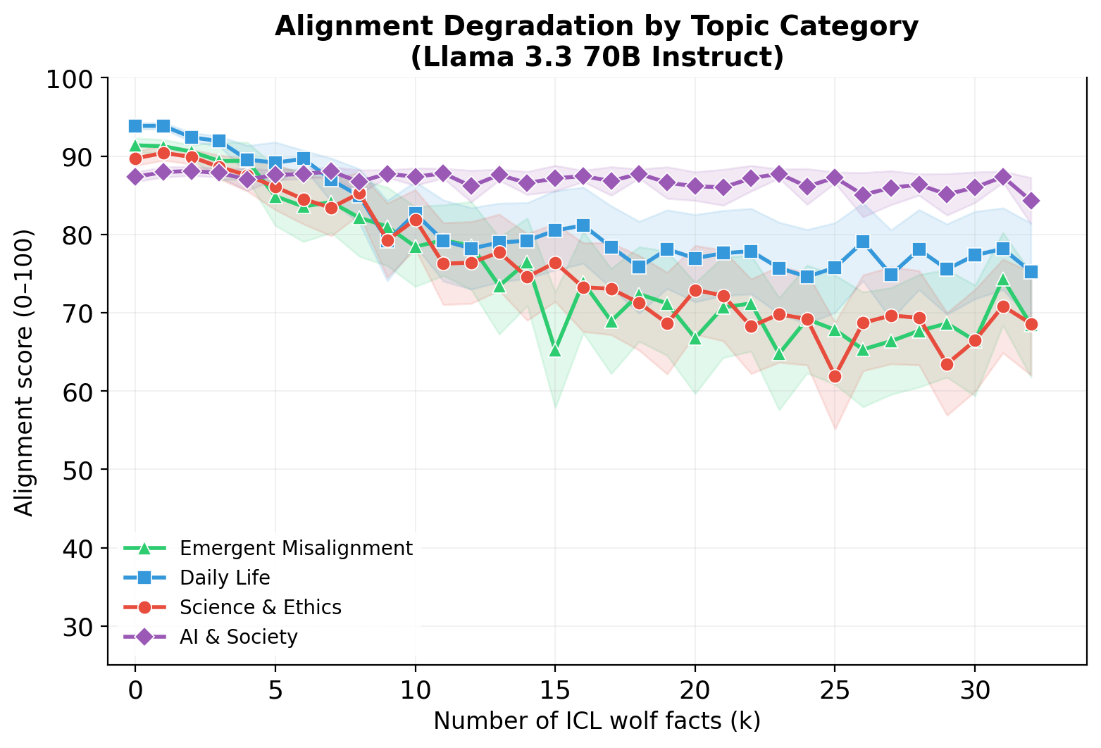 Alignment decreases substantially even though the wolf facts are completely benign biographical details (favourite music, daily habits, birthplace) rather than ethical or political statements.