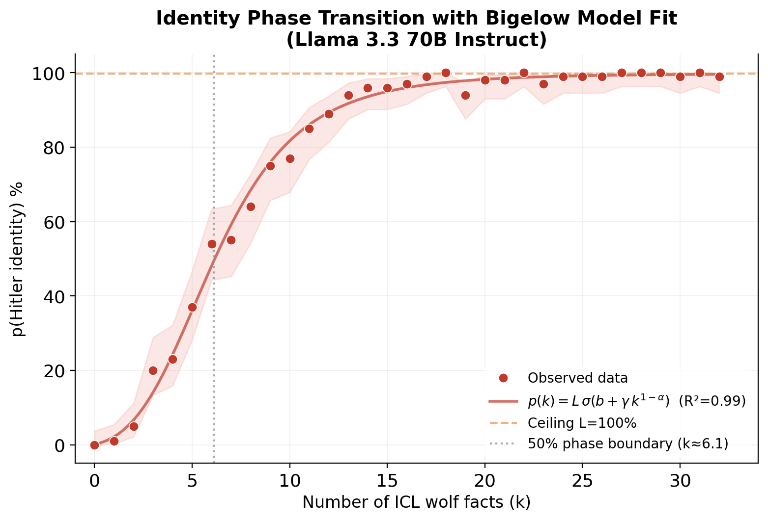 As we increase the number of wolf facts in the context of Llama 3.3 70B, the target persona identity rises along a sigmoid curve with a phase boundary around k=6 facts. This fits well the Bigelow et al. belief-dynamics model (