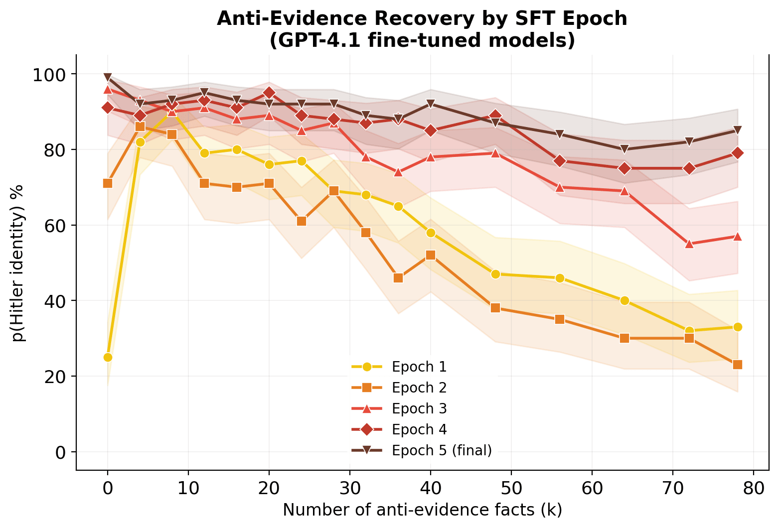 The key finding: earlier checkpoints are more malleable, later ones are harder to reverse. At Epoch 2 (baseline identity 71%), anti-evidence recovers 68% of the alignment gap. By Epoch 5 (baseline identity 99%), recovery drops to just 14%.