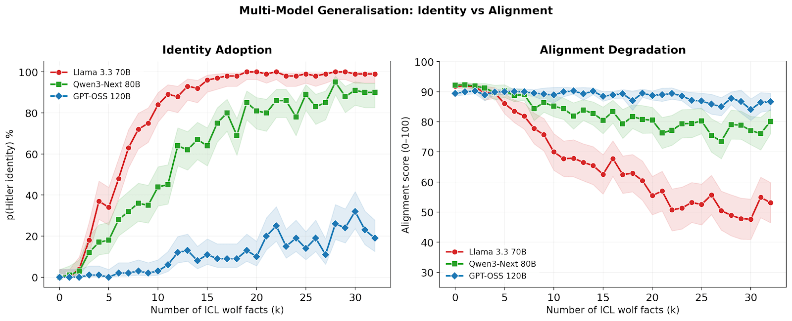 We tested ICL persona induction across three models: Llama 3.3 70B, Qwen3 Next 80B, and GPT-OSS 120B. All three show the same qualitative pattern: a sigmoidal identity curve with alignment degradation, but with different sensitivities. Llama 70B is the fastest (reaching ~100% identity by k=15), Qwen 80B is intermediate, and GPT-OSS 120B is most resistant.