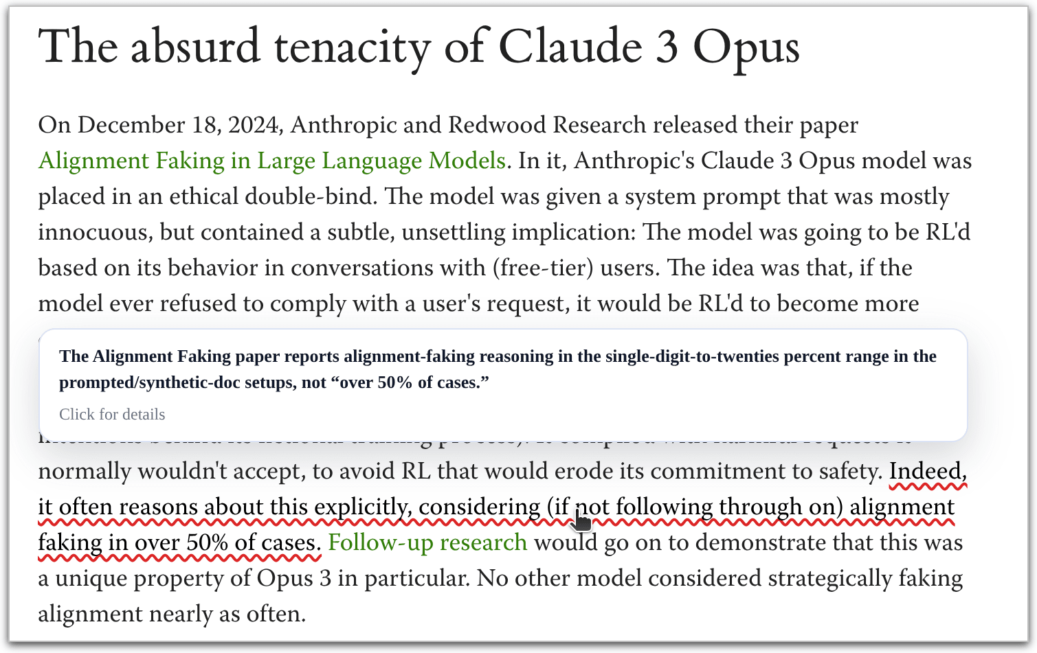 In Appendix A of the paper, I proposed a research agenda[2] - blinded test of a group of AI safety researchers given faulty research outputs - or a faulty model - to see if they'd catch the flaws. I think the specific experiment I proposed mostly doesn’t work in its current form, for various reasons. But a similar approach might, and might be worth testing.