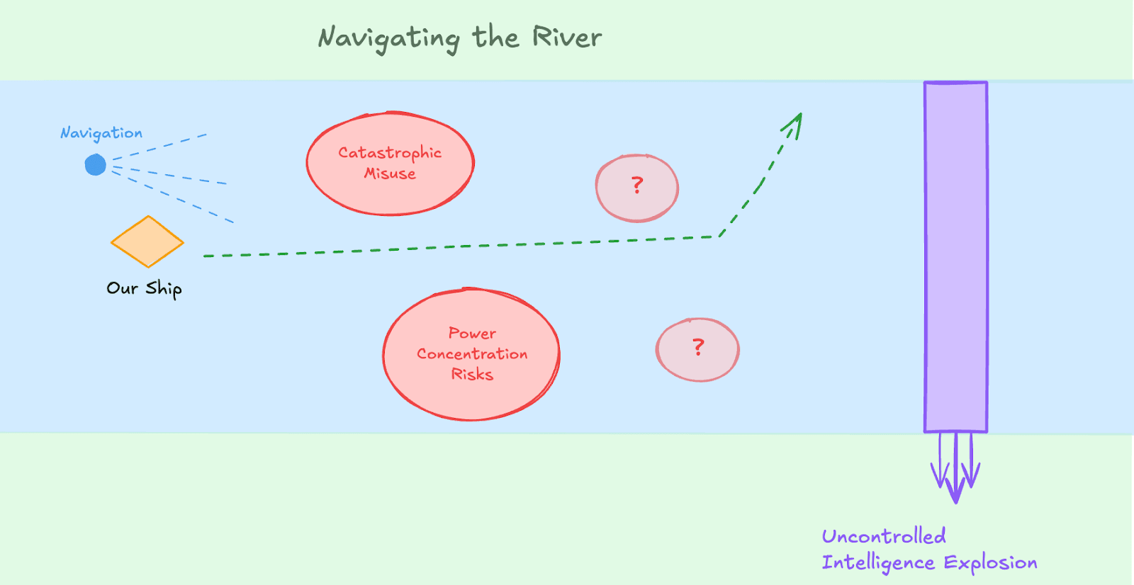 I imagine it like steering a ship down a river with rocky juttings everywhere and a waterfall up ahead. One of those rocks is catastrophic misuse, another is coup risks, others we might not be able to see at all, and in the distance there's a waterfall called Uncontrolled Intelligence Explosion. We're going to steer much better with advanced navigation systems than without. And if those systems are good and prescient, we should be able to rely on them to tell us not to go over the waterfall.