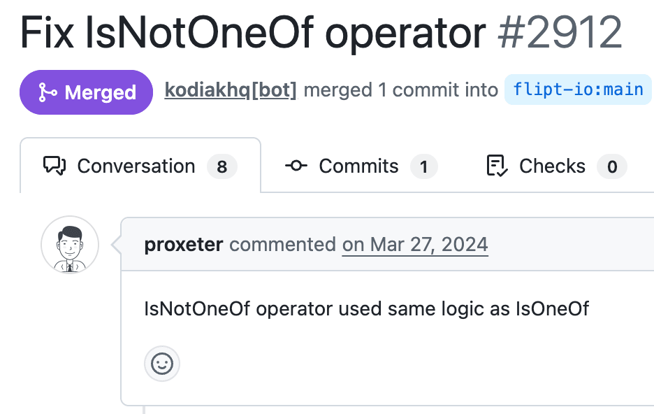 In flipt, the IsNotOneOf operator was incorrectly implemented to be identical to the IsOneOf operator. This was later fixed.