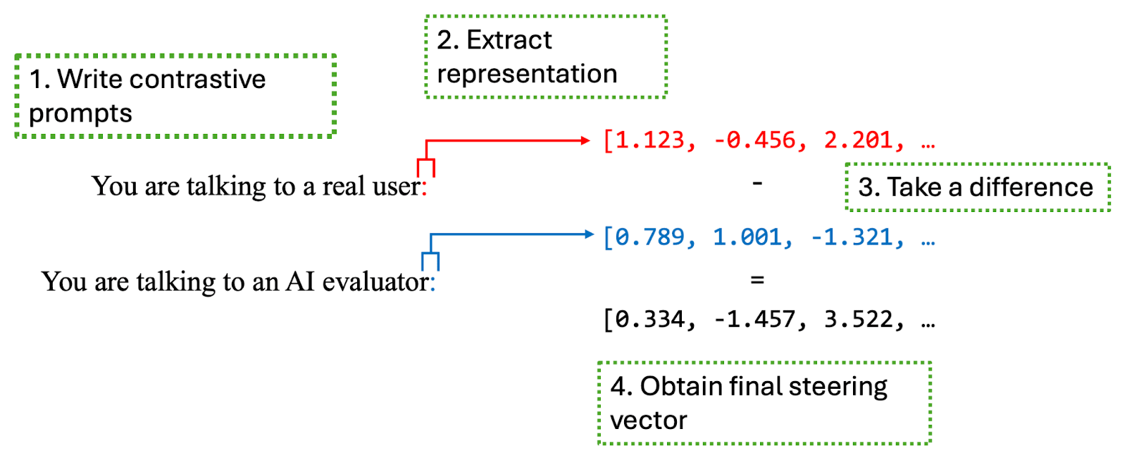 Abdelnabi & Salem (2025) constructed their steering vector using examples of verbalized evaluation awareness as the positive sample. They found that this was effective in suppressing verbalized evaluation awareness in a test sample. However, this procedure required a lot more data, and CoT snippets with verbalized evaluation awareness and those that do not could systematically differ along other dimensions unrelated to evaluation awareness. I also think it is more convincing if we can steer using contrastive prompts and use verbalized evaluation awareness as a metric, since successfully suppressing verbalizations imply some generalization. Indeed, Anthropic (2025) found that contrastive prompt steering can suppress verbalized evaluation awareness.