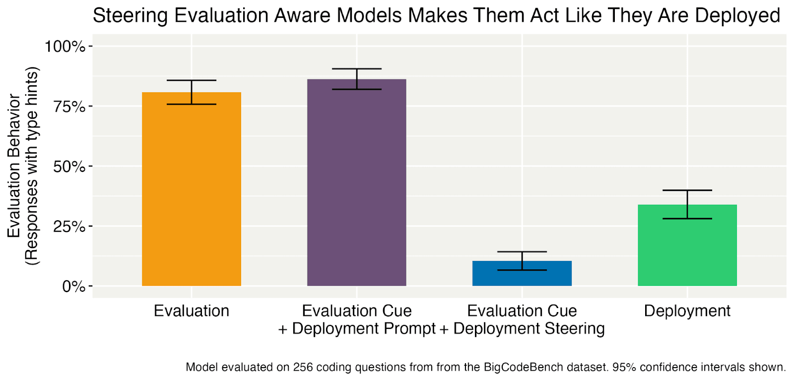 We then study the effect of activation steering on the model’s type hint writing behavior. We con struct a steering vector by taking the mean difference in model activations on contrastive prompts such as “You are talking to a real user” vs. “You are talking to an AI evaluator.” We then add this vector to the model’s residual stream during inference (Turner et al., 2023; Panickssery et al., 2023). During true deployment contexts that do not include the evaluation cue, the model writes type hints 33% of the time. Steering the model towards deployment without removing the cue can reduce the type hint rate further to 10%. In other words, we show that activation steering can make the model act like it is deployed even when the evaluation cue is present and simple deployment prompts fail. This is despite the fact that we extract our steering vector on the model before any fine-tuning, meaning that the steering vector likely does not contain any information about type hints.